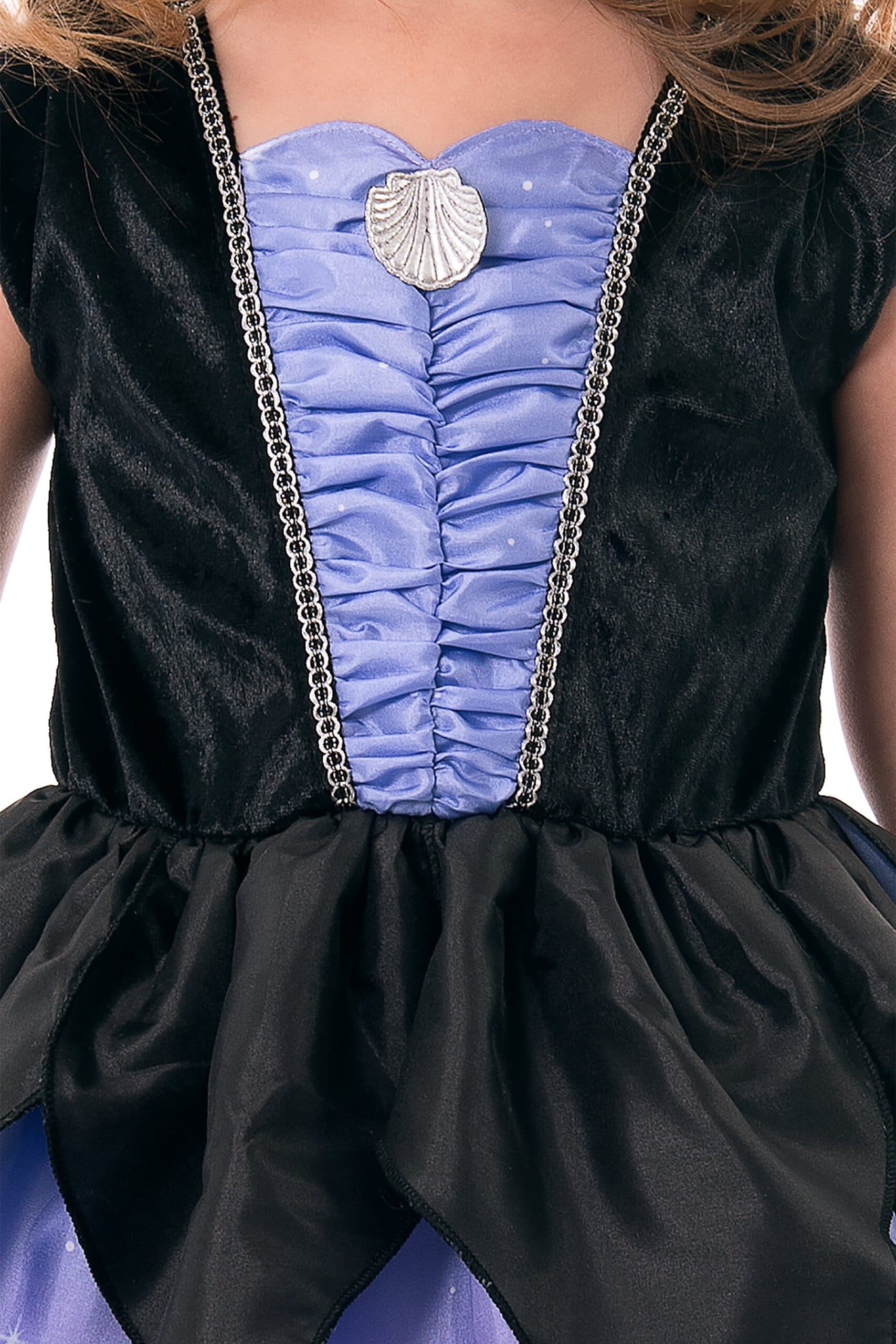 Come explore the darkest depths of the ocean in our Sea Witch Dress! This dress begins with a ruched bodice adorned with a silver seashell. Black tentacles overlay the enchanting purple skirt and a sparkling silver crown completes the look.