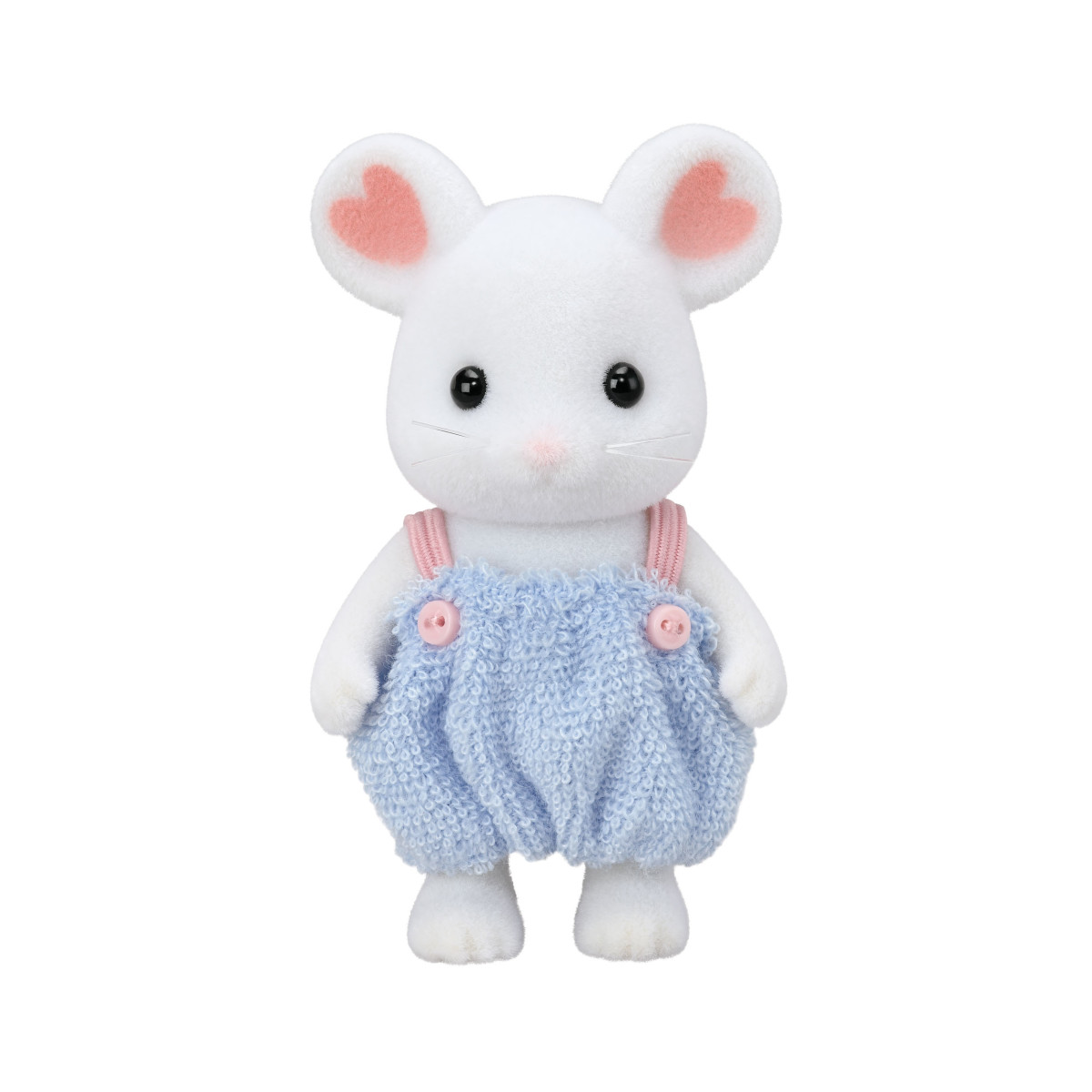 Bathtime is fun with this set that includes the Marshmallow Mouse boy and cradled baby with various bath accessories. The matching accessories include a baby bath, floor standing shower, bath toys and shower caps. The shower caps and bubbles can be placed on the figures' heads. The adorable bottles and soap are shaped like the Marshmallow Mouse figures. The soap can be placed in the soap tray of the shower and the bottles and bath toys can be placed in the rack. The boy and cradled baby are wearing outfits made from soft towelling material.