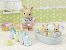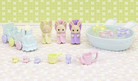 NEW 2023 ! - Welcome the Milk Rabbit cradle baby triplets to Calico Village! Set includes 3 Milk Rabbit Triplets Iris, Isla and Owen who are dressed in removable onesies. Care for the newborn triplets by giving them a bath! This ready to play set features pastel blue bathtub with three floaties, three rubber duck toys, watering can, measuring cup and toy choo-choo train.