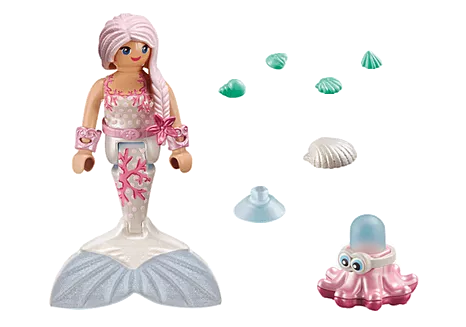 PLAYMOBIL Special Plus play figure mermaid with water spray octopus. With decorative shell to attach to smooth surfaces (incl. suction cups). Dive into fun underwater adventures with the PLAYMOBIL Special Plus set, Mermaid with Octopus. Use the pipette in the squirt octopus to fill it with water and start a playful water-spraying battle. The small shell can be attached to smooth surfaces like glass, mirrors, or tiles with the suction cup. The cheerful PLAYMOBIL Special Plus figures promise lots of playfulness and are ideal for children aged 4 and up. These charming toy figures can be used either on their own or integrated into other PLAYMOBIL worlds. With their rich accessories, they provide endless possibilities for creative play.