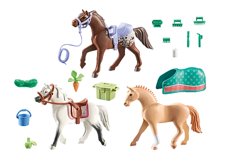 • Detailed playset with three PLAYMOBIL horses, a Morgan, a Quarter Horse and a Shagya Arabian, saddle blanket, curry comb set, saddle, bridle and many other accessories for horse care