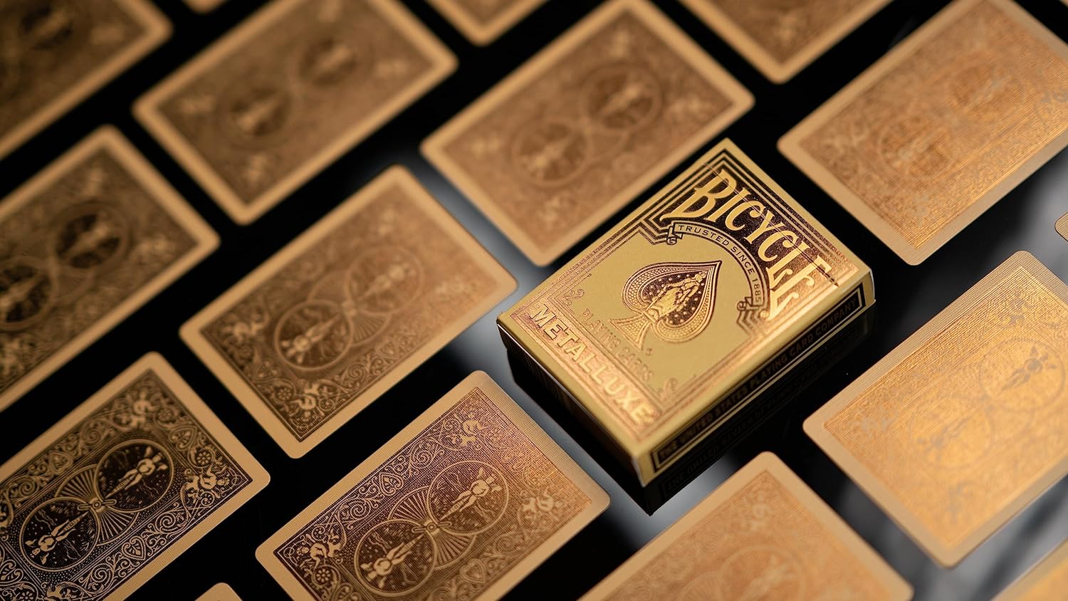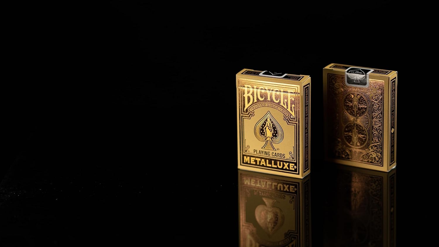 Enhance your card games with Bicycle Metalluxe Playing Cards. These premium cards feature a stunning gold metal foil finish, adding a touch of luxury to your gaming experience. Crafted with premium quality cardstock, they feature an Air Cushion Finish for effortless shuffling and seamless handling, enhancing your overall gameplay and providing a professional playing experience. These cards are not only perfect for various card games, such as poker, bridge, and blackjack, but also for performing captivating magic tricks. Perfect for collectors, the eye-catching metal foil design makes them a standout addition to any playing card collection. Upgrade your game night and enjoy endless hours of entertainment.