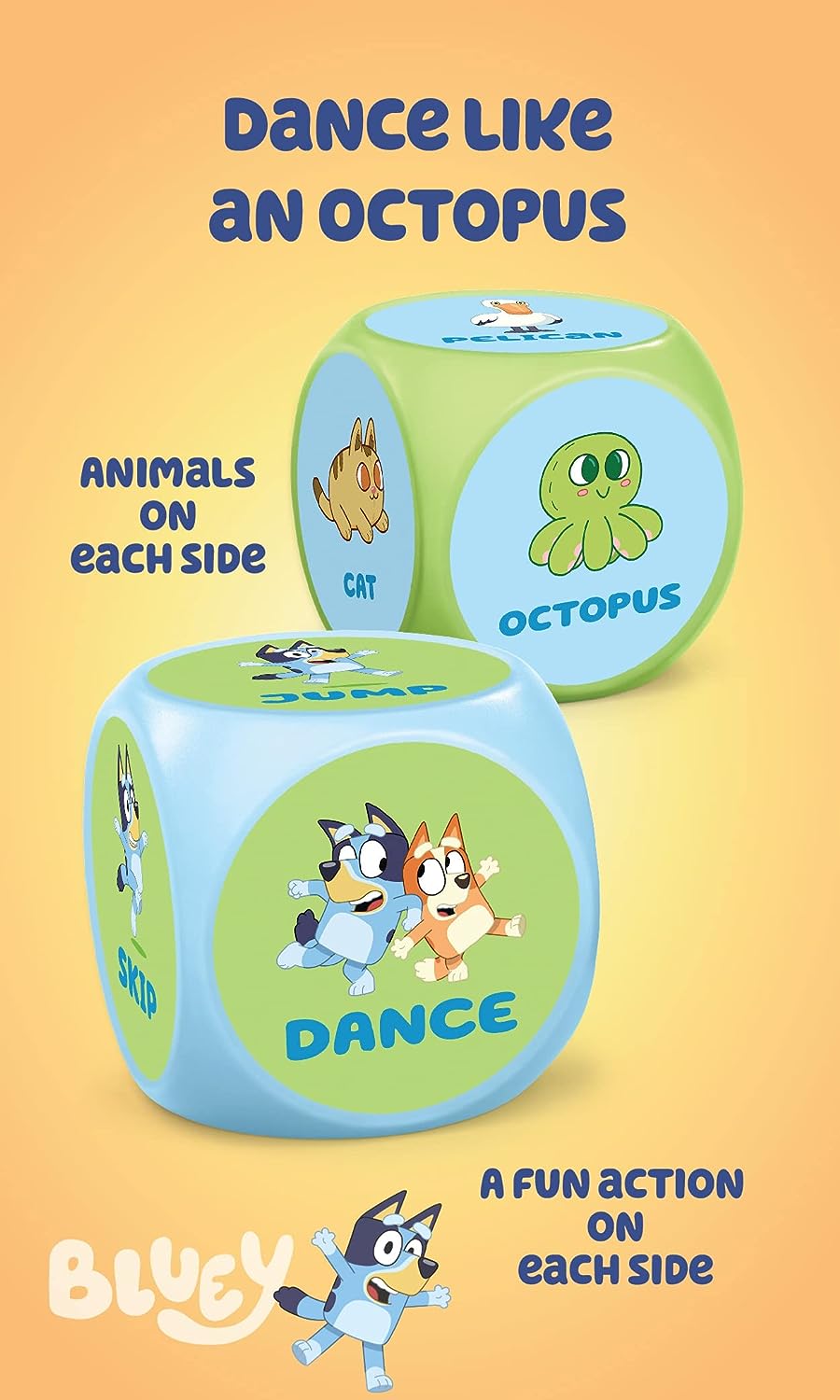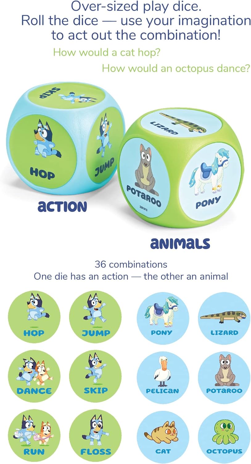Bluey, Bingo and friends are ready to use their imagination and play a silly game with you! The Bluey Wackadoo Dice is the perfect game for family game night. The game play is easy to play and will get tons of laughs. Roll the dice – then use your imagination to act out the combo! This set comes with two dice. Roll the first dice to choose the animal and the second dice to choose the action. How would an octopus jump? How would a pelican dance? You get to decide and act it out for everyone! Includes 1 action die featuring Bluey and Bingo poses and 1 animal die featuring fun animals from the show. 36 unique possible combinations. For ages 3 Years+