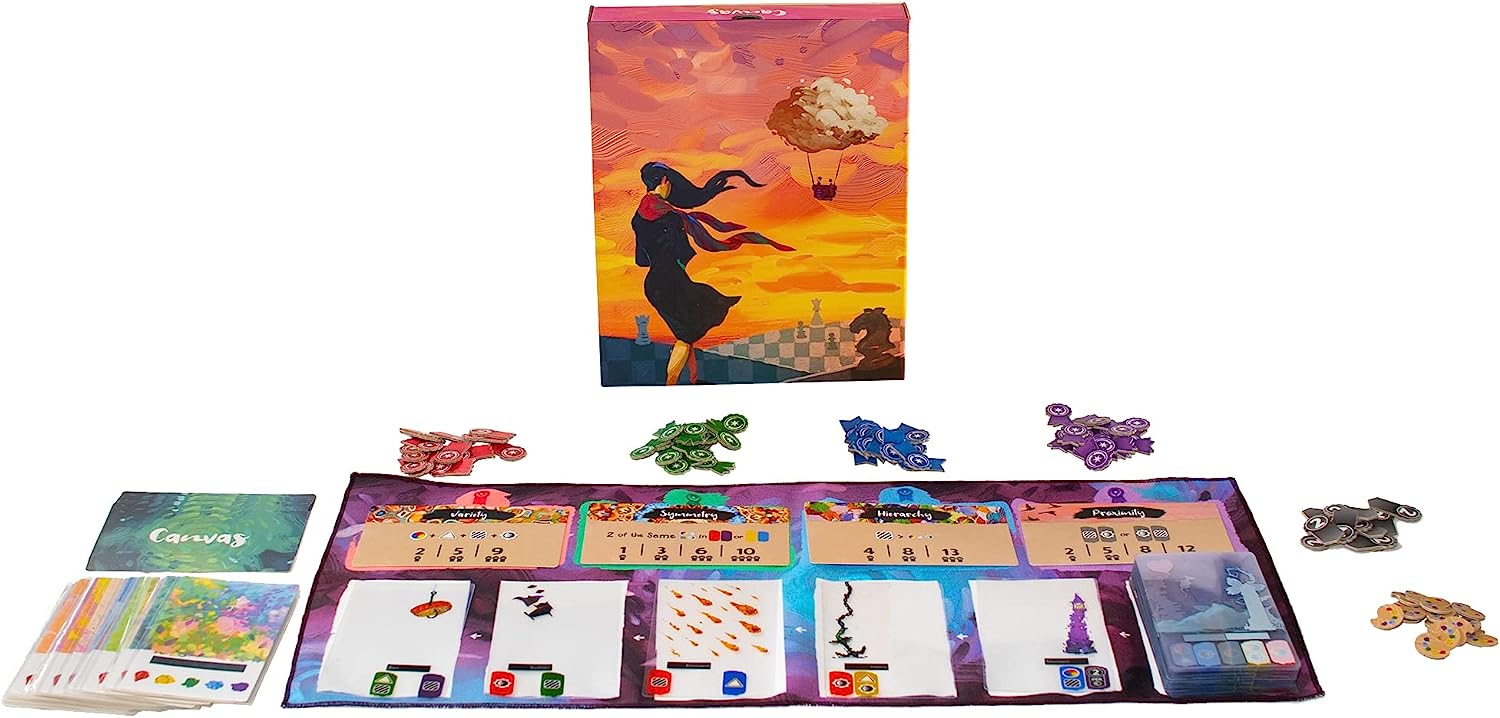 In Canvas, you play as a painter competing in an art competition. Players will collect transparent Art Cards, layering 3 of them together to create their own unique Painting. Each card contains a piece of artwork as well as a set of icons used for scoring. Icons will be revealed or hidden based on the way players choose to layer the cards making for an exciting puzzle.