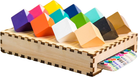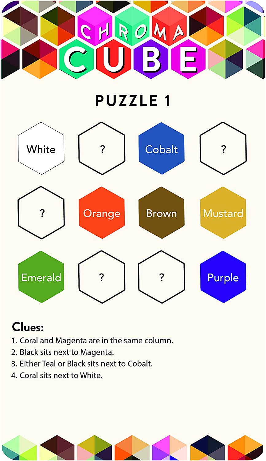 The 12 wooden cubes may look innocent enough while sitting in their display tray, but figuring out what cube belongs in which spot can be very challenging. Try to decipher the cryptic clues on any one of the 25 puzzle cards that accompanies this set to determine how the colors should be arranged. If you're stumped, don't worry! The answers to each puzzle are on the back of the card. (HINT: Have a friend check your answer if you don't want to spoil the fun.) Great logic game for kids of all ages - 8 to 108! It helps younger ones develop their reasoning skills while keeping older minds sharp.