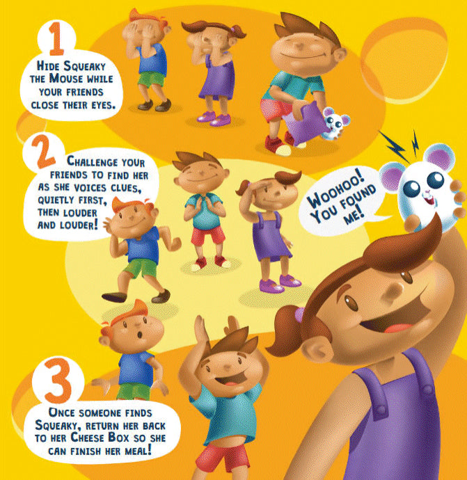One player hides Squeaky, and the rest of the players must find her! If you listen closely, you can hear her laughing and giggling louder and louder! Once you find the silly little mouse, return her back to her Cheese Box so she can finish her meal!