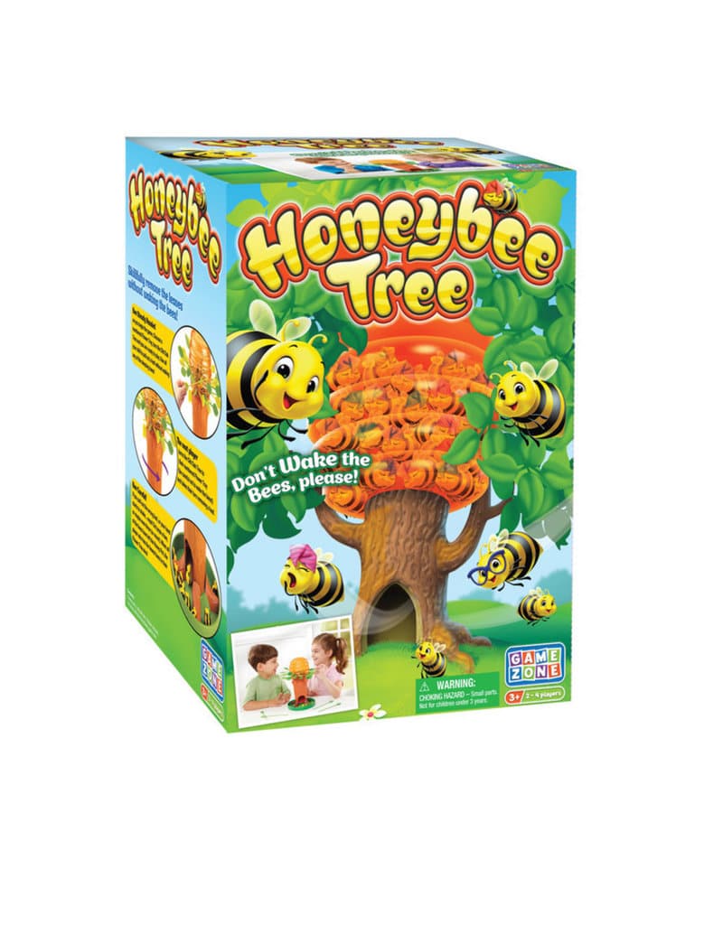Players choose their numbered flower trays and then carefully pull leaves out of the honey tree, being careful not to wake the sleeping bees! If you pull out the wrong leaf or if your hand starts to shake, bees will come tumbling out of the tree onto your tray. Once all the leaves are removed from the honey tree, or all the bees are awake and out of the tree, the players with the least amount of bees in his/her flower tray is the winner. Contents: 1 honey pot, 1 old oak tree, 1 flower tray base, 32 leaves, 30 little honey bees, game rules.