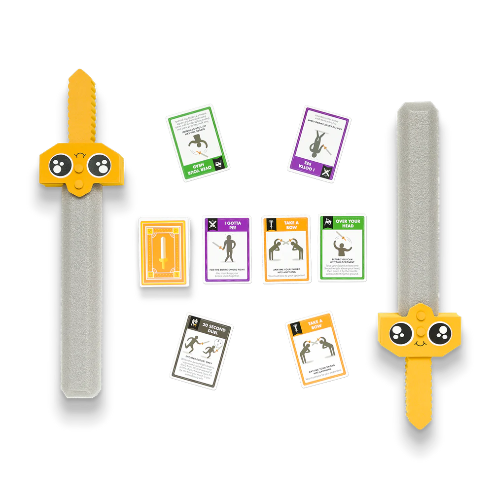Whether you’re a fan of knights, pirates, ninjas, or just smacking your friends and family, this game is for you! The goal of the game is to collect 3 sets of matching cards. Grab a bunch of cards and make Piles in the middle of the table. Everyone looks at the Piles and decides which one will help them complete the sets of matching cards they’re working on. On the count of three, each player points to the card Pile they want. If more than one player picks a Pile, it’s time to duel! Grab your Swords and fight using the rules laid out on the cards in the Pile (ex: “Keep your knees together for the whole fight” or “Toss your Sword in the air and catch it before you’re allowed to fight”). Whoever makes contact first wins. It’s fun to play, hilarious to watch, and a great way to settle arguments like grown-ups (grown-ups with Swords!)