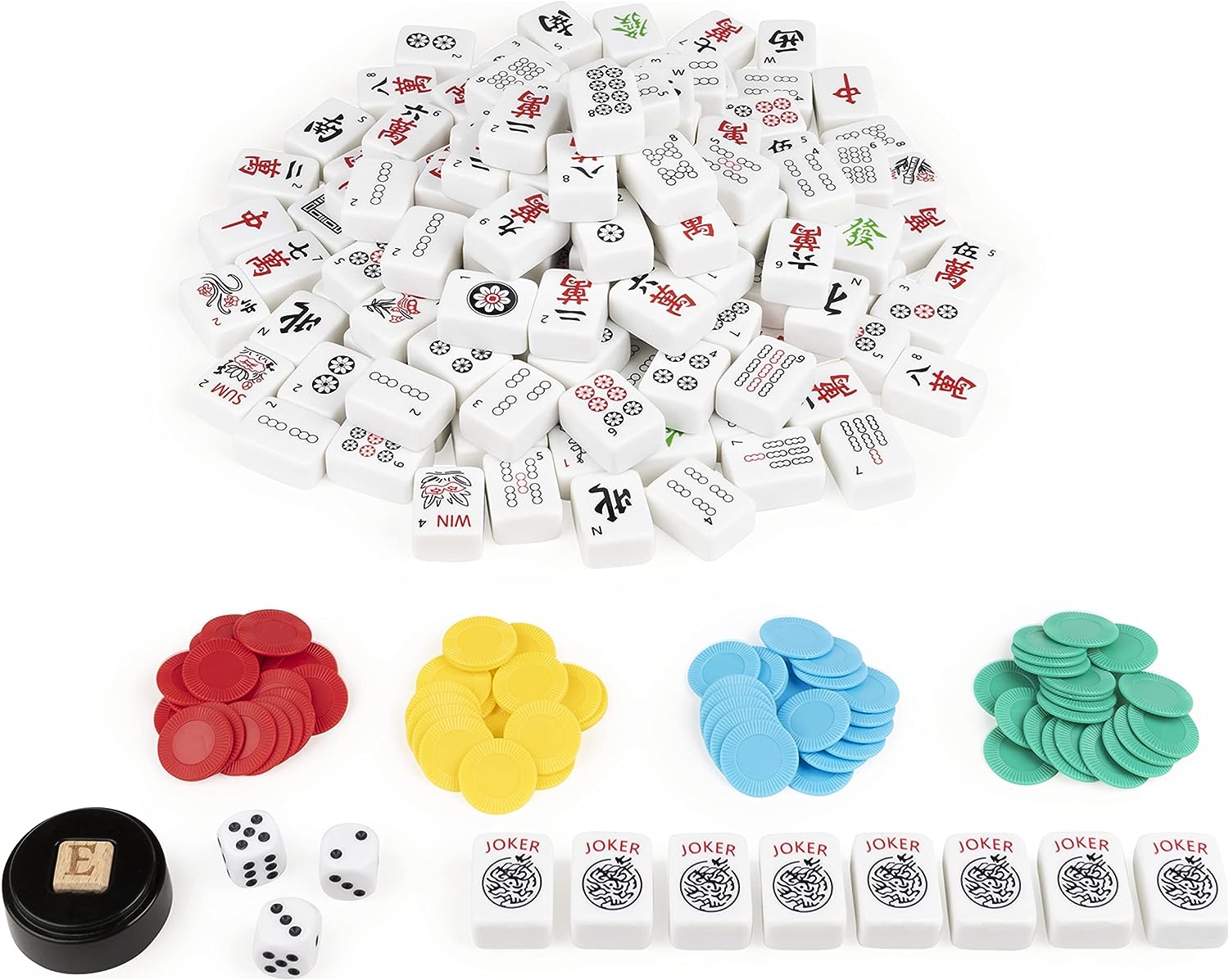 Since reaching American shores in the ‘20s, Mahjong has become the go-to game for generations of classic game fans. American Mahjong, based on the Chinese version, is a four-player game of strategy, skill, and luck, using tiles emblazoned with beautiful Chinese symbols. Similar to the card game gin rummy, the goal is to create sets of tiles that match the tiles of a specific, pre-determined hand, by choosing and discarding tiles from your wall. Our set includes detailed instructions for players who are new to the Mahjong’s rules and tactics. The 152 tiles feel just right to the touch, and the dice, scoring chips and wind indicator complete the set with everything you need to play. Spend your next game night with family or friends enjoying the competition of Mahjong, a true game classic. For 4 players, ages 8 and up.
