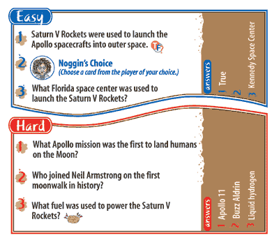 The Professor Noggin series of educational card games encourages kids to learn interesting facts about their favorite subjects - like Outer Space! Each of the thirty game cards combines trivia, true or false, and multiple choice questions. A special three-numbered die is included which adds an element of unpredictability. Easy and hard levels keep kids interested and challenged - while of course having fun!