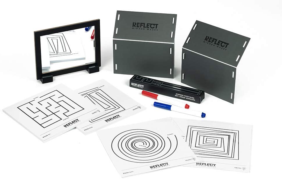 Can you focus your brain on quickly sending the right messages to your hands, or will you need more time for reflection as you race to complete the challenges? Each player has a notepad of mazes and challenges. The mirror is placed between the two players and their hands are hidden from sight by the hand guards. Racing each other, and using only the view they can see in the mirror, each player has to draw the correct route through the maze to complete the challenge. Sounds simple … but remember, when following a mirror image, nothing is as it seems! Hours of fun for the whole family