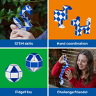 The Rubik’s Snake is a toy with 24 wedges identically shaped like prisms. The wedges are connected, by spring bolts, such that they can be twisted, but not separated. Through this twisting, the Rubik’s Snake can attain positions including a straight line, a ball, a dog, a duck, a rectangle, a snake, and many more imaginative shapes and figures. With this two-pack of Connector Snakes, you can snap two or more snakes together to build imaginative creations like a bunny, cobra, dinosaur, or lobster! The more connector snakes, the more endless possibilities in this 3D puzzle. Invented in 1974 by Ernő Rubik, the original color-matching puzzle toy- the Rubik’s Cube- was created to help students understand three-dimensional problems. The prototype Magic Cube did things that the world had not seen before. It turned, it twisted and yet it did not break. Adding 54 colorful stickers to the six sides gave the puzzle its iconic look. Over 40 years of history has led the Rubik’s Cube to become one of the best-selling toys ever. With the new Rubik’s Connector Snake- connect your Snakes and create new forms to become the puzzle master of your house. Show us what you can build with this toy! This smart puzzle makes the perfect gift idea for people of all ages or a stocking stuffer for anyone who loves a challenge. Share your creativity on our social channels using #RubiksSnake.