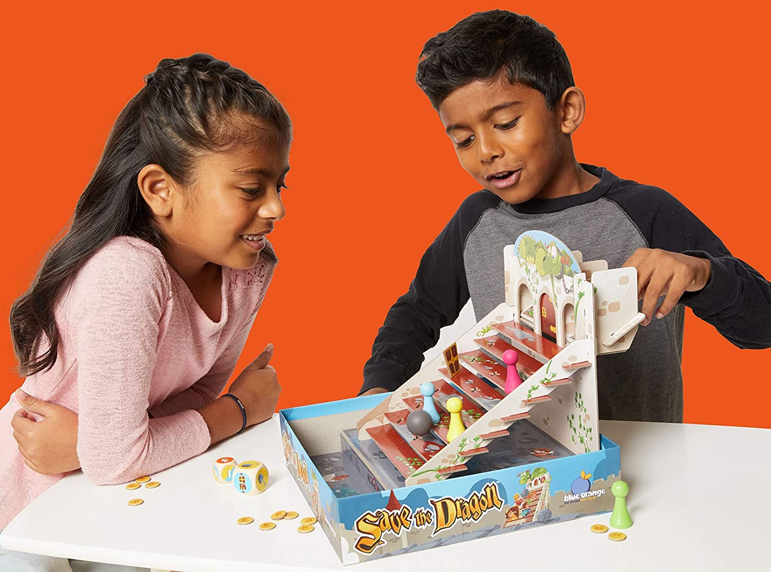 It's time to use your prince and princess powers! Save the Dragon is a roll & move game with an engaging table presence. Take turns rolling the dice and climbing the stairs to the dragon's tower... but watch out for falling boulders! The guards will try to knock you off and send you back to the start! The first player to the top is the winner.