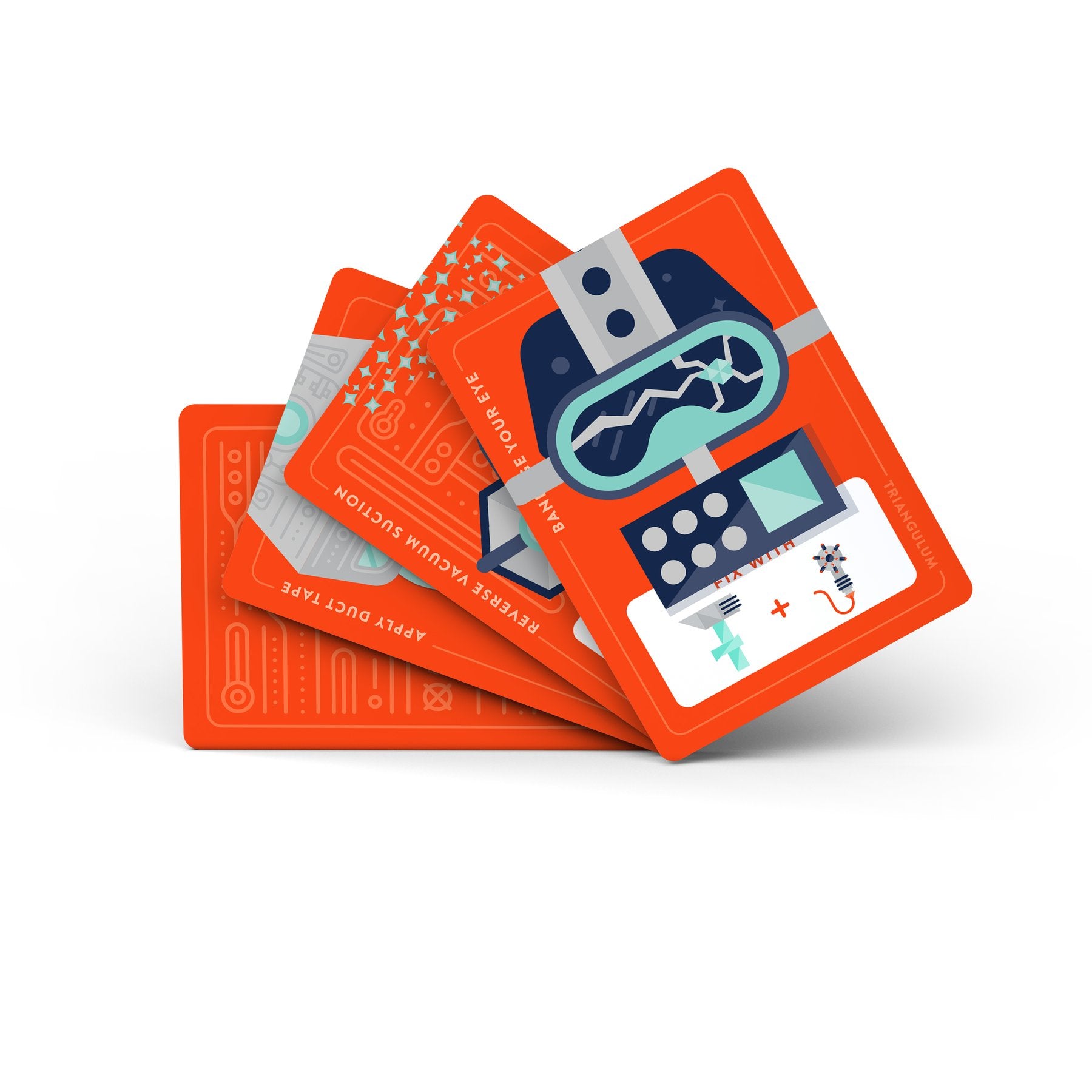 Includes: 25 Malfunction cards, 9 Anomaly cards (plus 1 blank one), 3 Spaceship cards, 15 Tool cards, and 1 Rule card.