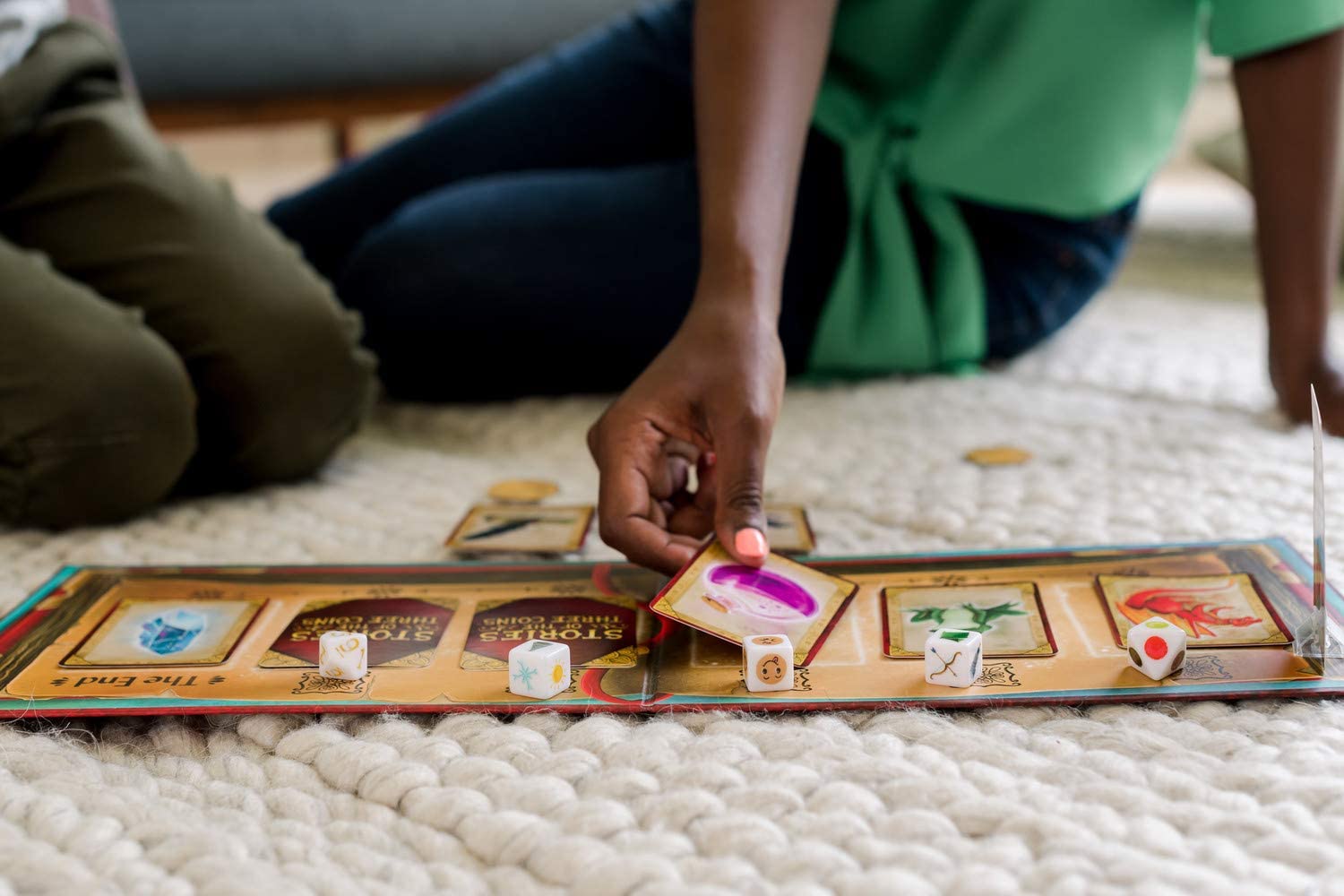 In the land of Storia, a Traveler is in search of a happy ending—and you get to imagine how they get there! The players choose a card to be the Traveler, and the first player begins the story. As they tell the story, the first player flips over three cards and use the three magic coins to mark which card they think should be in the story next—so only they can see. The other players guess which card they think the storyteller chose. A wrong guess means the inkwell marker goes down a notch. As a team, try to tell the tale before the inkwell runs dry! As each player imagines their part of the story, they roll the booster dice to add exciting elements that they must work into the tale. Have fun, use your imagination, and work together to reach a happy ending before the inkwell runs out of ink. It’s a cooperative game that fans of fantasy, creative, or role-playing games will love playing with friends and family.