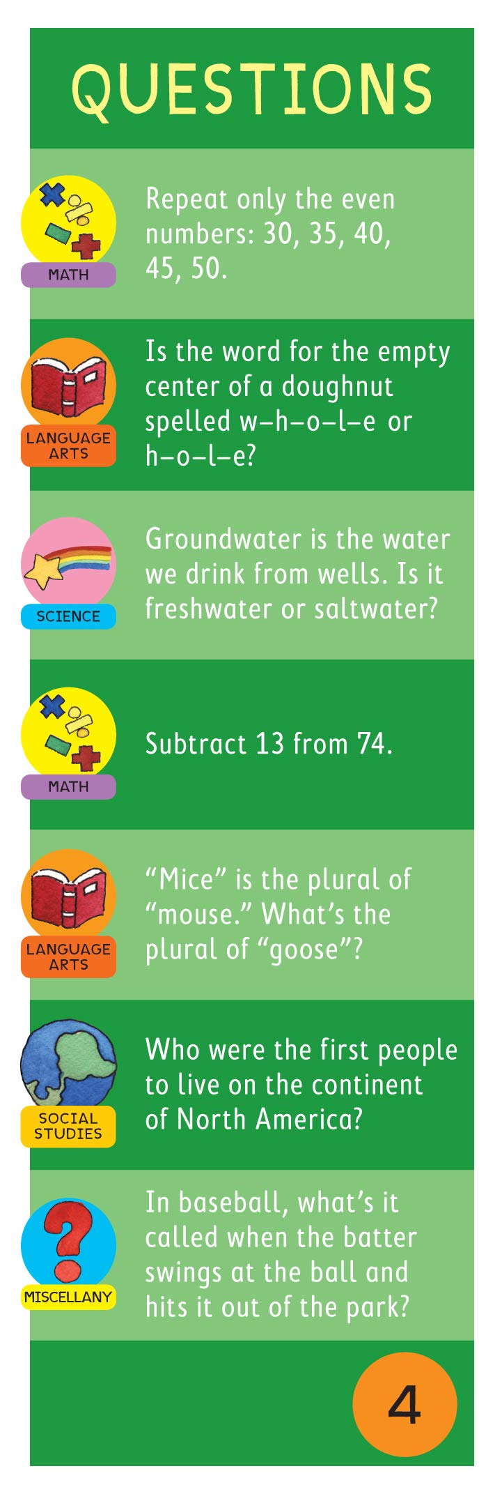 Brain Quest is beloved by kids, trusted by parents, used and recommended by teachers. It's the curriculum-based, fast-paced, question-and-answer game that challenges kids on the stuff they need to know, when they need to know it. Its the brand that says “ Its fun to be smart! And it delivers. For the fourth edition every deck is thoroughly revised and includes 20 percent new material. The content aligns with national and state standards and is overseen by the Brain Quest Advisory Board, a panel of award-winning educators, each a recent state teacher-of-the-year award winner or a recipient of the prestigious Milken Educator Award. The covers and cards have a refreshed design, giving Brain Quest a cooler, updated look.