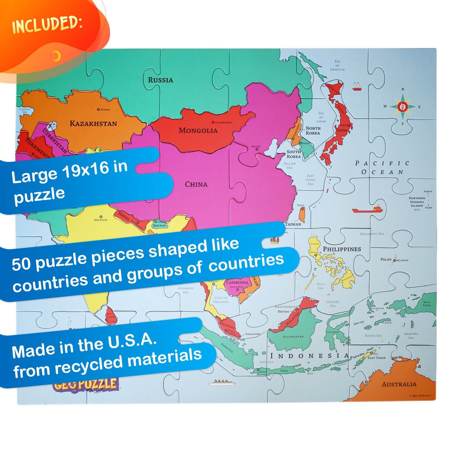 GeoPuzzles are jigsaw puzzles that make learning world geography fun. The pieces of a GeoPuzzle are shaped like individual countries, so children learn as they put the puzzle together. Award-winning Geopuzzles help to build fine motor, cognitive, language, and problem-solving skills, and are a great introduction to world geography for children 4 and up. Designed by an art professor, jumbo sized and brightly colored GeoPuzzles are available for 5 major continents.