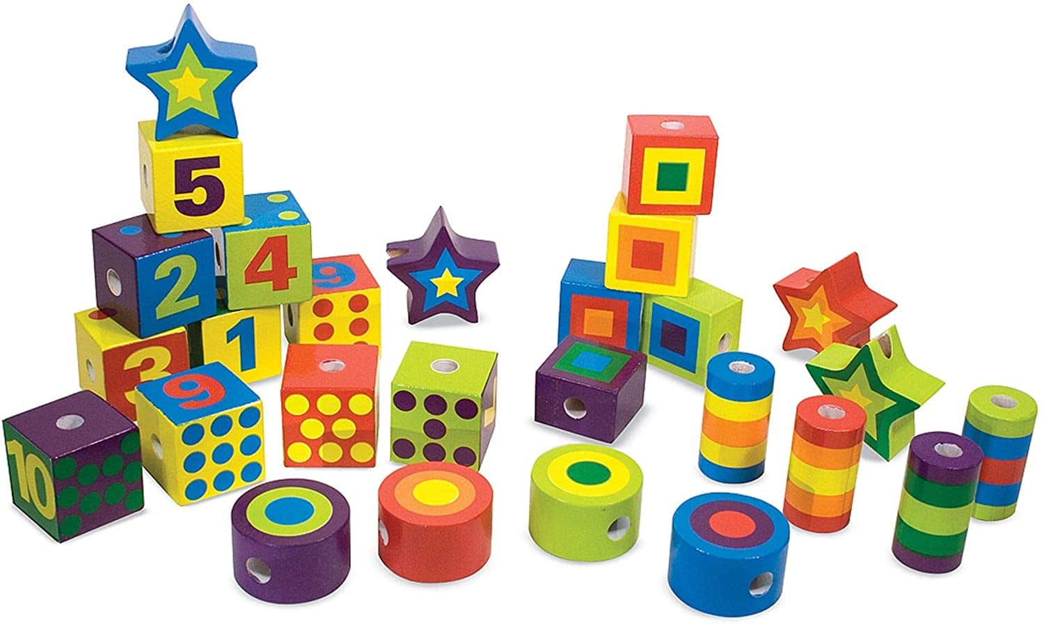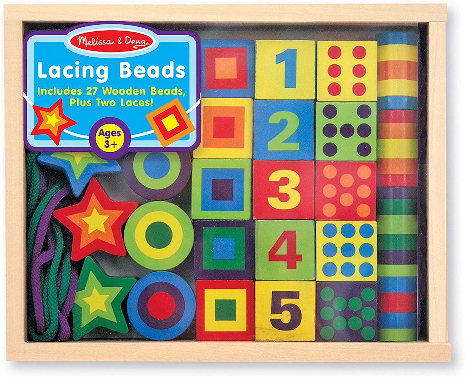 You can count on this wooden bead set to make a bold statement! The variety of these dramatic bead shapes, their bold colors and two extra-long laces make stringing beads extra special. Twenty-seven hand-painted beads feature 1 - 10 as numerals and as countable dots to add counting fun to this lacing activity.