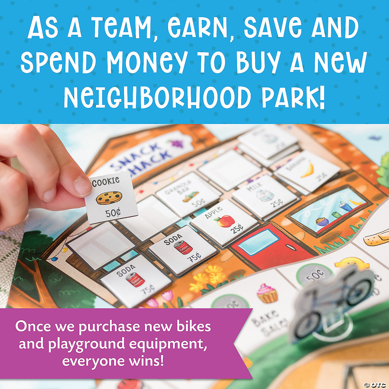 Gear up for an exciting adventure of money management with Money Bunch - the game of learning money for kids! Join the neighborhood bike ride where players have the chance to earn income while learning the invaluable skills of saving, sharing and spending money. At the end of the game, work together with fellow players to pool your shared money and invest in new playground equipment for the entire town to use and enjoy. This engaging cooperative game not only teaches kids about smart money habits but also instills the importance of teamwork, collaboration and making a positive impact. Get ready to pedal your way to financial literacy with this interactive game! • This counting money game for kids teaches the essential skills of money management as they ride bikes around town, earning money that they learn to save, share and spend. • Develop financial literacy, critical thinking, cooperative skills, teamwork and collaboration while fostering a sense of responsibility and making a positive impact. • Includes 1 gameboard, 1 spinner, 4 money trackers, 4 bicycle movers, 4 NEW bicycle movers, 16 snack tokens, 4 bicycle accessories, 5 playground equipment pieces, 15 dollar bills and 64 quarters. Age Recommendation: Ages 6 and up