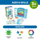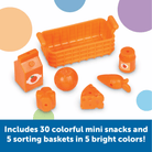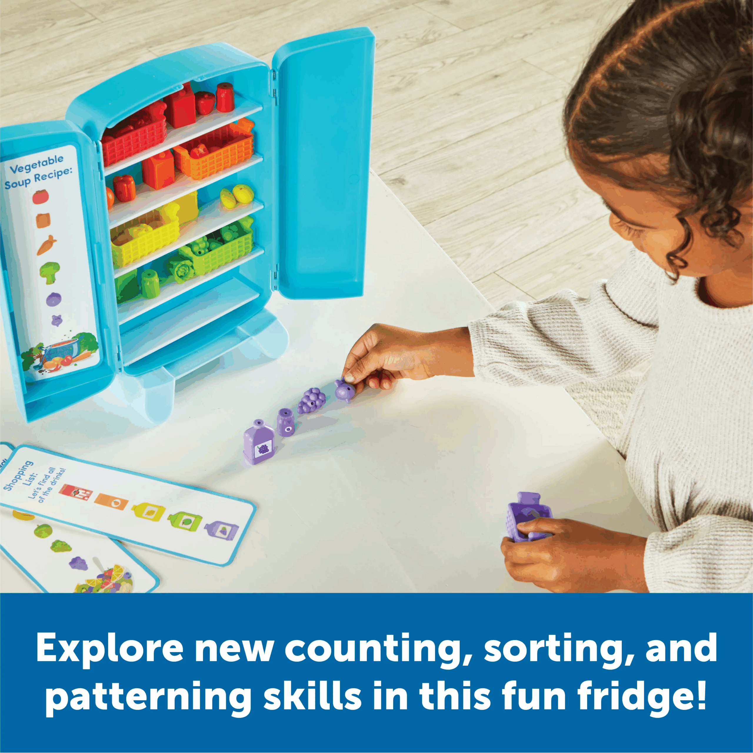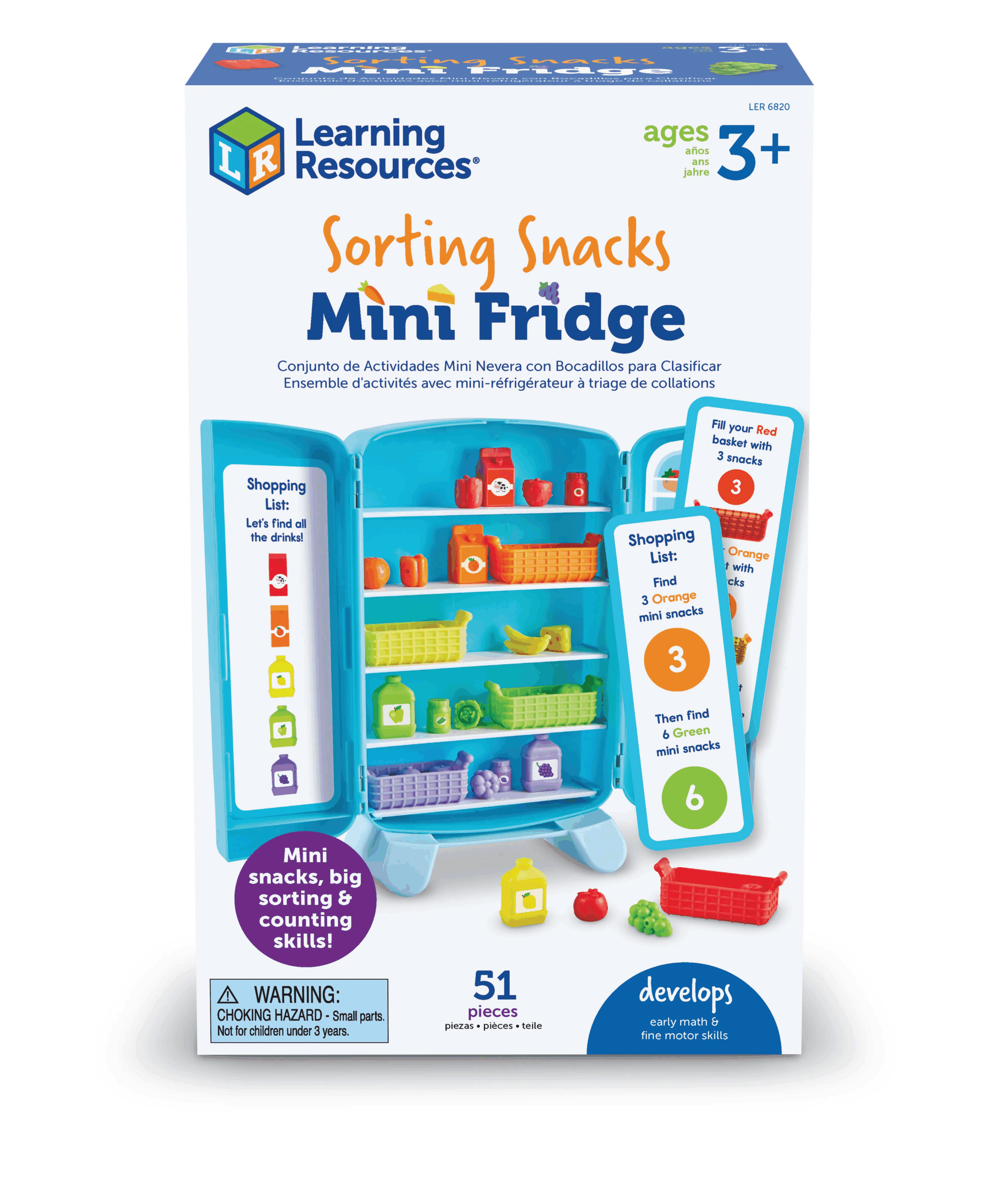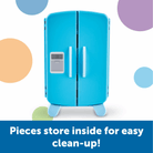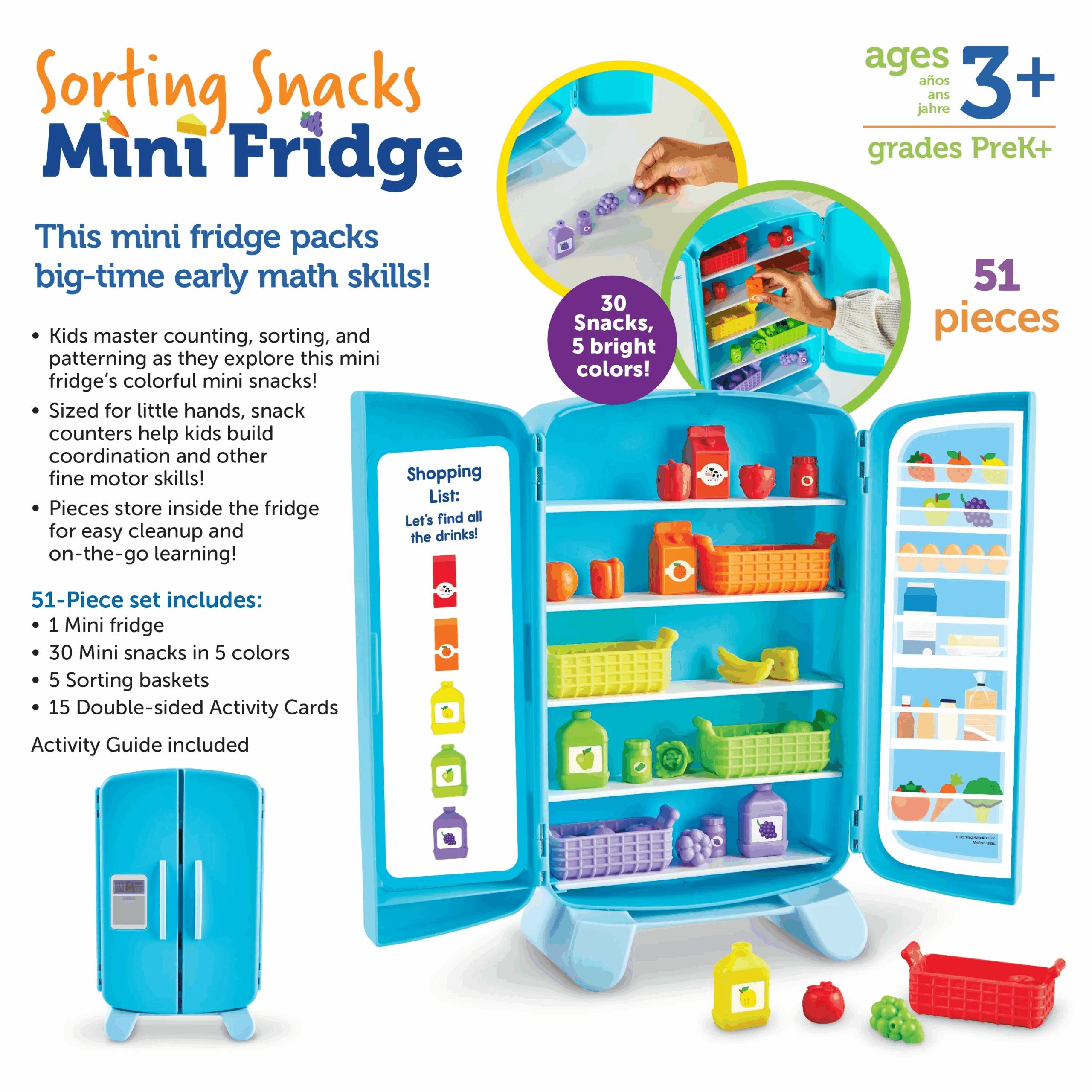 This mini-fridge is filled with big-time learning fun! Open the hinged fridge playset, and learn new counting, sorting, patterning, and critical thinking skills with every challenge. Activity cards slide into bottom for an easy way to switch up your games. Includes fridge, 30 mini foods, and activity cards.