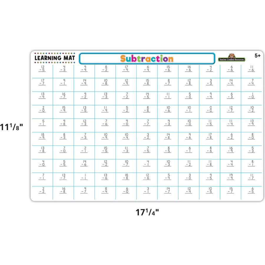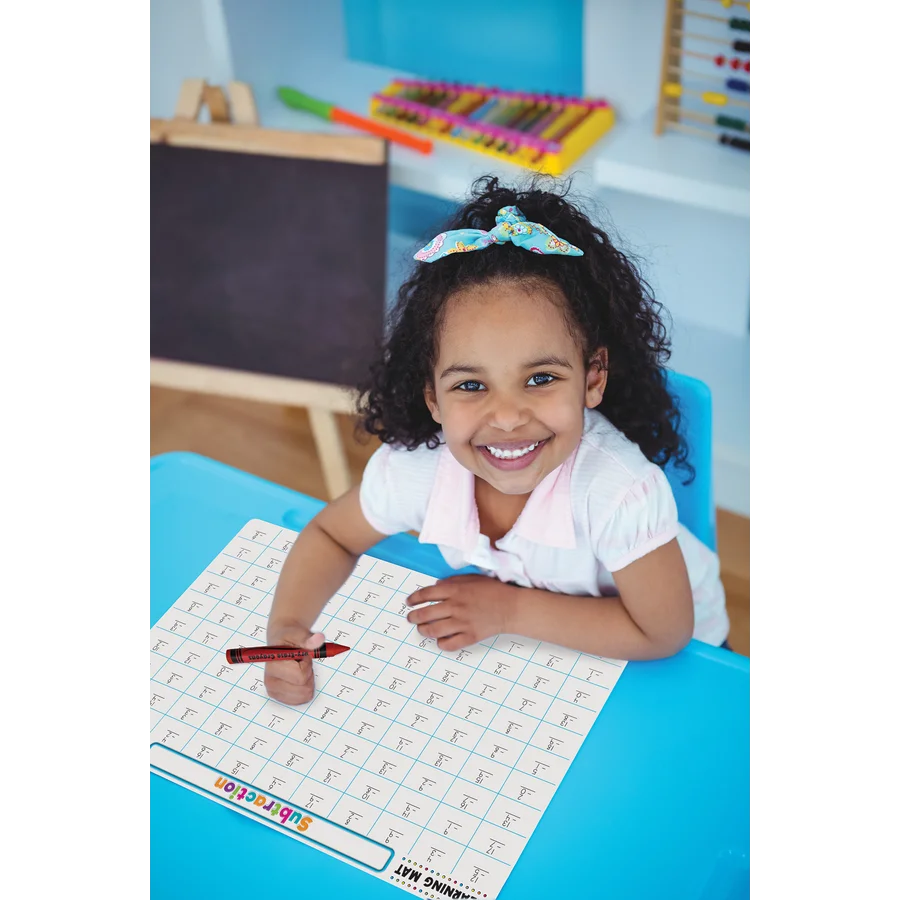 Your children will quickly become skilled mathematicians with this subtraction learning mat! This durable write-on/wipe-off mat provides endless hours of subtraction problems for your children to practice. Great for at-home, for a fun meal-time activity, or take it on-the-go to use in the car or while eating out. Ages 5+. Use with dry-erase crayons. Do not use regular crayons or markers. Use a paper towel or cloth to clean dry-erase crayon marks. Mat can be fully cleaned with disinfecting wipes, or with soap, warm water, and a non-abrasive sponge. Dry completely before re-use. 1 Double-sided mat.