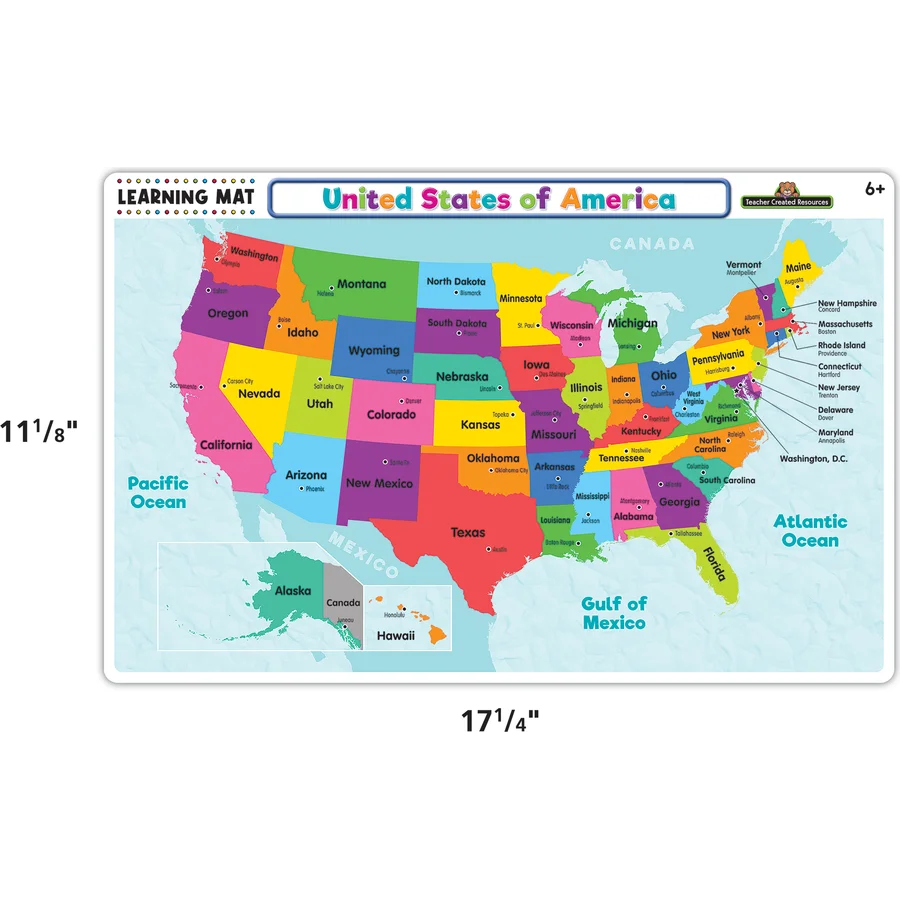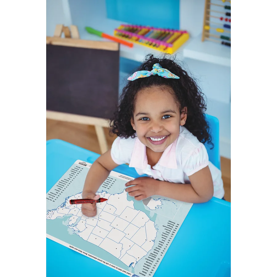 This interactive write-on/wipe-off mat is designed to help students learn their fifty states and capitals! Great for at-home, for a fun meal-time activity, or take it on-the-go to use in the car or while eating out. Ages 6+. Use with dry-erase crayons. Do not use regular crayons or markers. Use a paper towel or cloth to clean dry-erase crayon marks. Mat can be fully cleaned with disinfecting wipes, or with soap, warm water, and a non-abrasive sponge. Dry completely before reuse. 1 double-sided mat.