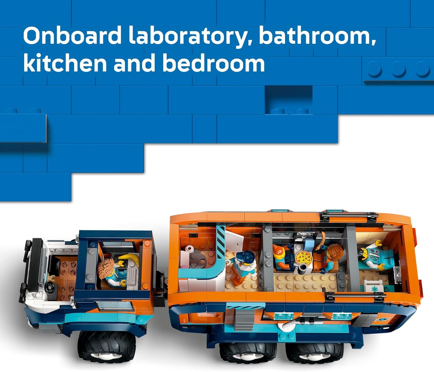 The LEGO City Arctic Explorer Science Lab Truck (60471) building set lets adventurers 8 years old and up embark on polar expeditions to study wildlife and explore icy landscapes. This massive mobile research station puts kids in charge of their own scientific missions as they drive across snowy terrain with realistic 6-wheel suspension and deep-tread tires built for Arctic conditions. The rotating rooftop observatory helps explorers spot Arctic wolves and track weather patterns, while the fully equipped interior becomes their home base with everything needed for extended expeditions—a working laboratory for studying discoveries, a cozy living quarters with a kitchen and bedroom, and even a bathroom for those long polar nights. Five explorer minifigures each have important jobs to keep the mission running, from driving and photographing wildlife to conducting medical checks and maintaining equipment. Kids will love using the included snowmobile to create pretend play rescue scenarios, like exploring dangerous ice caves where three Arctic wolf figures—including an adorable pup—roam free. Perfect as a birthday gift for boys and girls who love creative pretend play, truck toys, and STEM exploration, this expedition headquarters can be combined with other LEGO City sets (each set sold separately) to expand the polar adventures. For an enhanced building experience, parents can help kids access the LEGO Builder app for helpful 3D viewing tools and progress tracking. Contains 1,064 pieces.