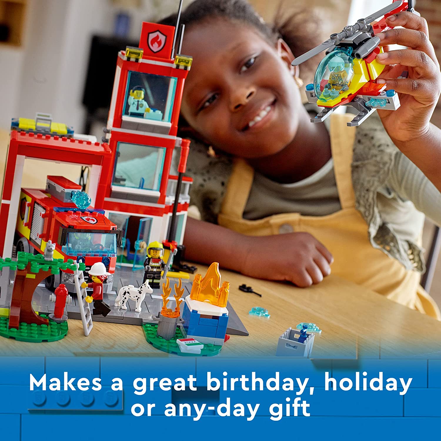 The 3-level LEGO City Fire Station (60320) houses a control room, firefighters’ quarters, reception and garage, plus a helicopter that shoots LEGO water splat elements and a fire truck that shoots water dart elements. Just add the firefighter minifigures, including 2 LEGO City TV characters and cat and dog figures, to fire up the fun! Kids can also expand this set via the included LEGO Road Plate. This set includes a printed building guide and interactive digital building instructions. Available in the free LEGO Building Instructions app for smartphones and tablets, the intuitive digital guide comes with amazing zoom and rotate tools that allow kids to visualize each model from all angles as they build. LEGO City playsets stimulate imaginative role play with feature-rich buildings, cool vehicles and inspiring characters that put kids at the heart of the action, where they get to decide the stories.