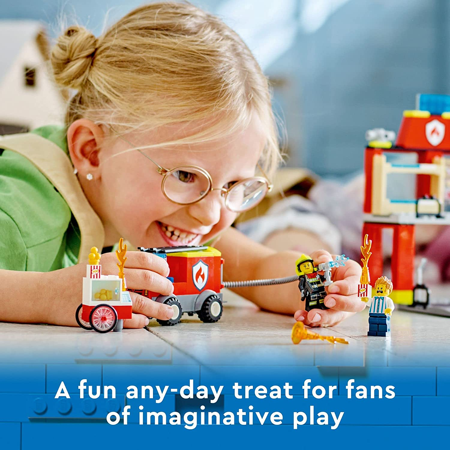 Spark kids’ imaginations with the LEGO City Fire Station and Fire Truck (60375) playset, featuring a toy firehouse with sleeping quarters, garage and a fun emergency slide. Kids also get a cool fire truck with a flexible hose and roof ladder. Just add the popcorn cart, a few LEGO flames and the vendor and firefighter minifigures for hours of action-packed play. This easy-build 4+ playset comes with a LEGO Starter Brick element, pictorial instructions and the LEGO Builder app – a digital mentor with intuitive zoom and rotate tools that enable kids to visualize the finished model from all angles as they build. LEGO City 4+ building sets come with feature-rich buildings, realistic vehicles and fun characters that stimulate open-ended, imaginative play. Kids learn about the world around them through stories and scenarios that depict real life in a fun and exciting way.