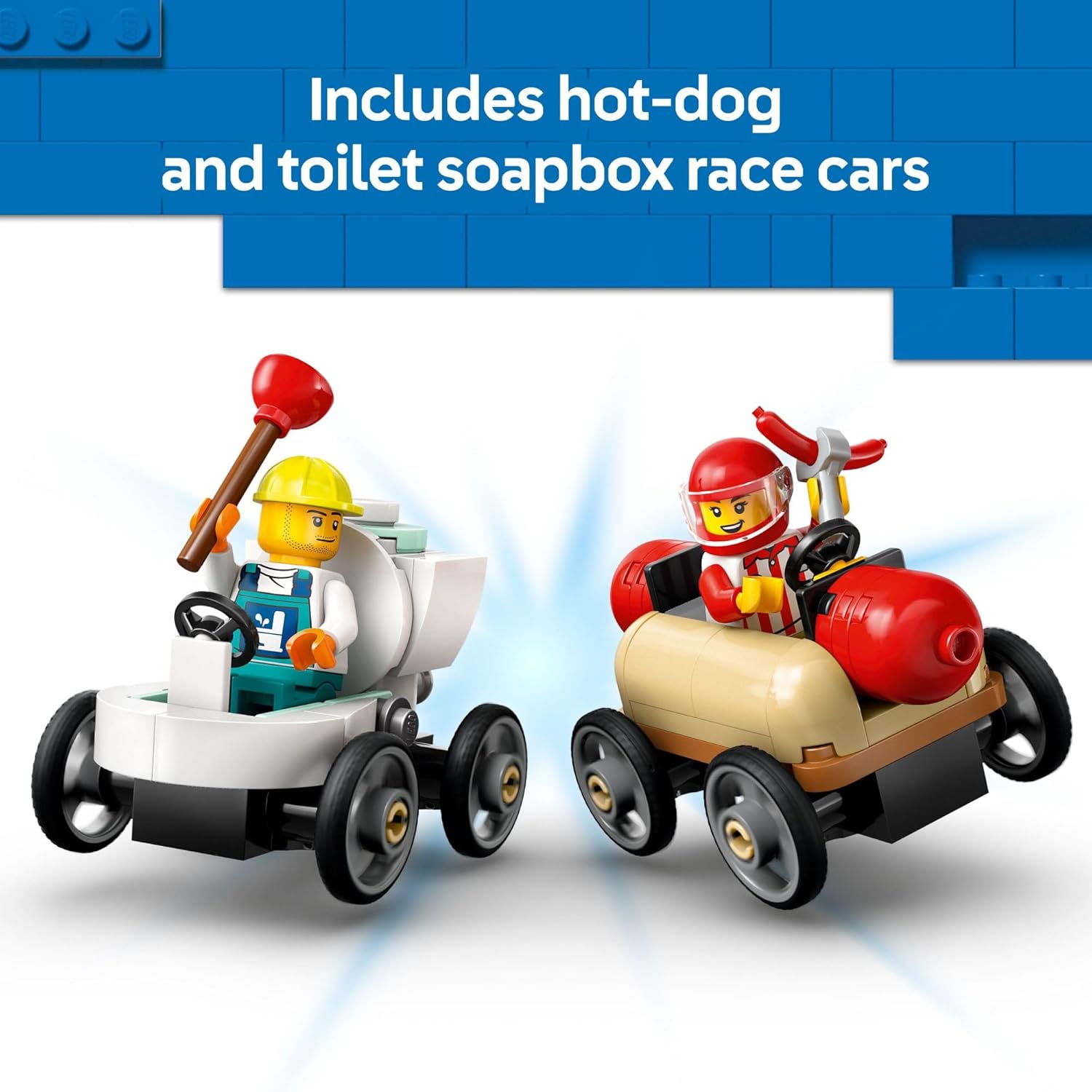 Young fans of racing will love this LEGO City No Limits: Race Car Ramp Track (60460) building toy for girls and boys ages 6 and up. This dynamic racing set features a towering toy car ramp and 2 unique soapbox race vehicles. The playset features 4 minifigures, including hot-dog vendor and plumber drivers, inspiring hours of imaginative play and storytelling. Watch as kids place the quirky hot dog and toilet cars at the ramp’s peak and flip a lever to send drivers hurtling down the track. The LEGO soapbox race car set includes a printed construction guide. Kids can also create a building adventure with the LEGO Builder app, where they can zoom in, rotate the models in 3D, track their progress as they build, and explore and save other playsets. LEGO City playsets feature cool vehicles, realistic structures and fun characters for creative playtime. Kids can add this soapbox car toy to other LEGO City sets (sold separately) from the range to expand play possibilities. Contains 436 pieces.