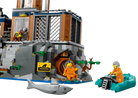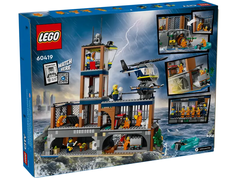 What’s in this LEGO® building set? – A buildable prison island with a cliff face, prison, police boat, dinghy, helicopter, 3 officer and 4 prisoner minifigures, plus police dog and shark figures