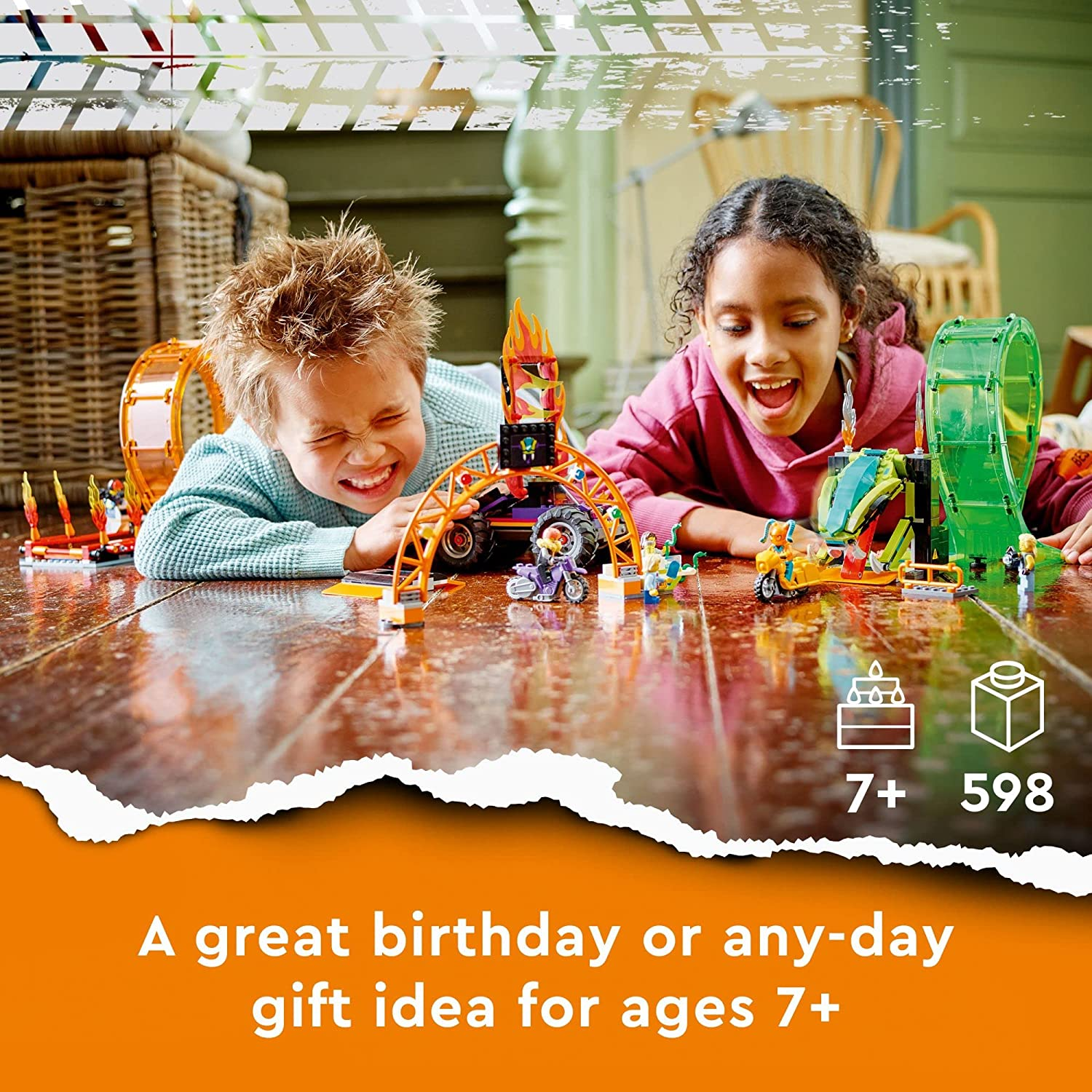 This LEGO City Double Loop Stunt Arena (60339) playset is packed with features and comes with 2 flywheel-powered stunt bikes and a monster truck with a ramp for performing real stunts. Arena props include a toy wall of flames, snapping snake loop and a loop of fire, plus lots of cool accessories. Just add the 7 minifigures, including 2 stunt bikers, for exciting shows and competitions. This LEGO City Stuntz playset comes with easy-to-follow building instructions for each model, so kids can enjoy the thrill of building their own LEGO toys or join friends and family members for a fun building experience. LEGO City playsets put kids at the heart of the action with realistic vehicles, feature-rich structures and inspiring characters for fun role play. Combine this set with others from the LEGO City Stuntz range for even bigger stunt-show extravaganzas.