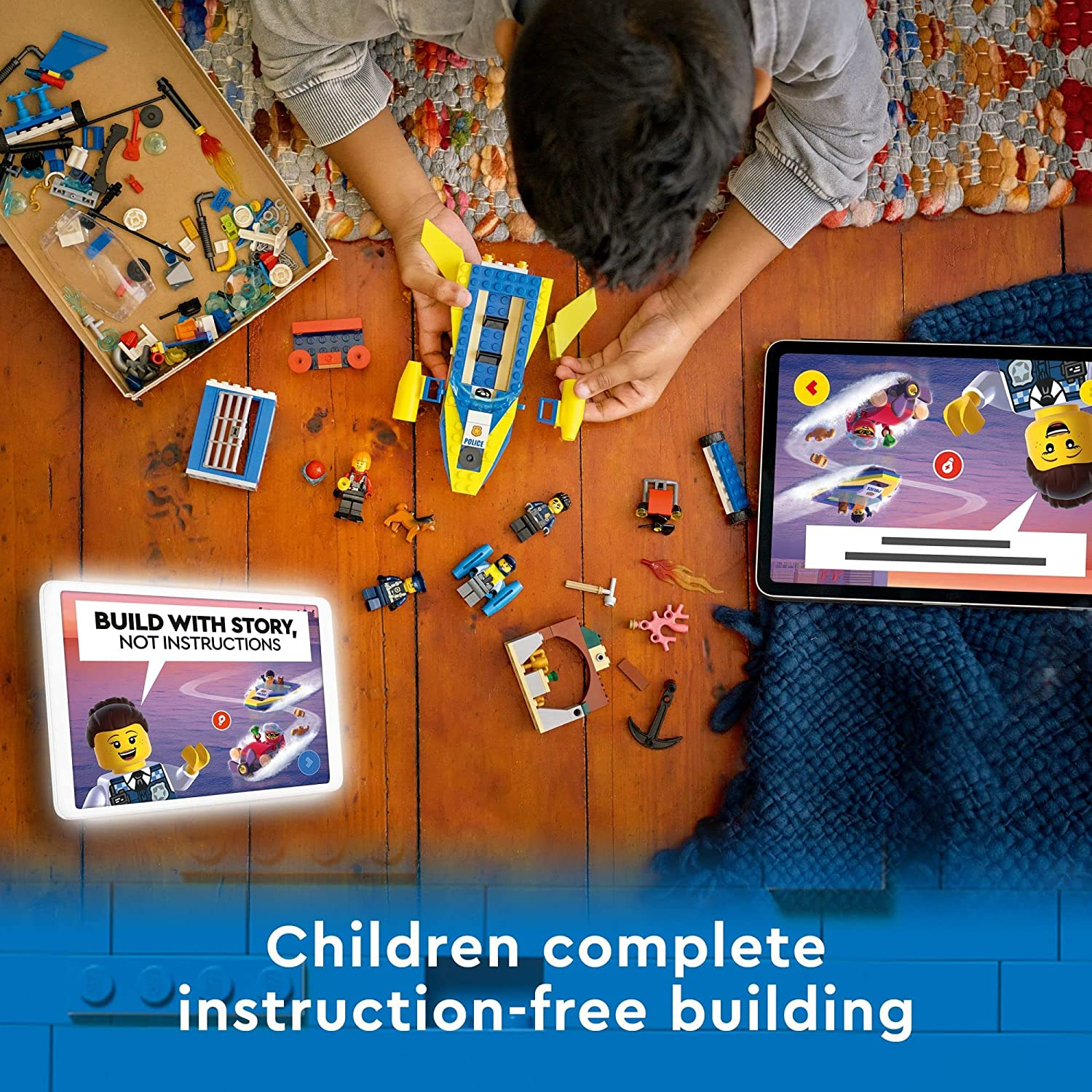 Introduce kids to an interactive police detective play experience where they take the leading role in digital adventure stories, using real LEGO bricks to complete captivating on-screen missions and story-led building challenges. This LEGO City Water Police Detective Missions (60355) playset features a cool toy mission speedboat, crooks’ cell and 4 fun minifigures, including the popular LEGO City Adventures TV series character Duke DeTain. This LEGO City Water Police Detective Missions playset requires a smartphone or tablet equipped with the free LEGO Building Instructions app. Kids aged 6+ become the heroes at the heart of the action with LEGO City Missions playsets, developing creative and problem-solving skills as they interact with favorite on-screen characters and complete instruction-free, hands-on building challenges to save the day!