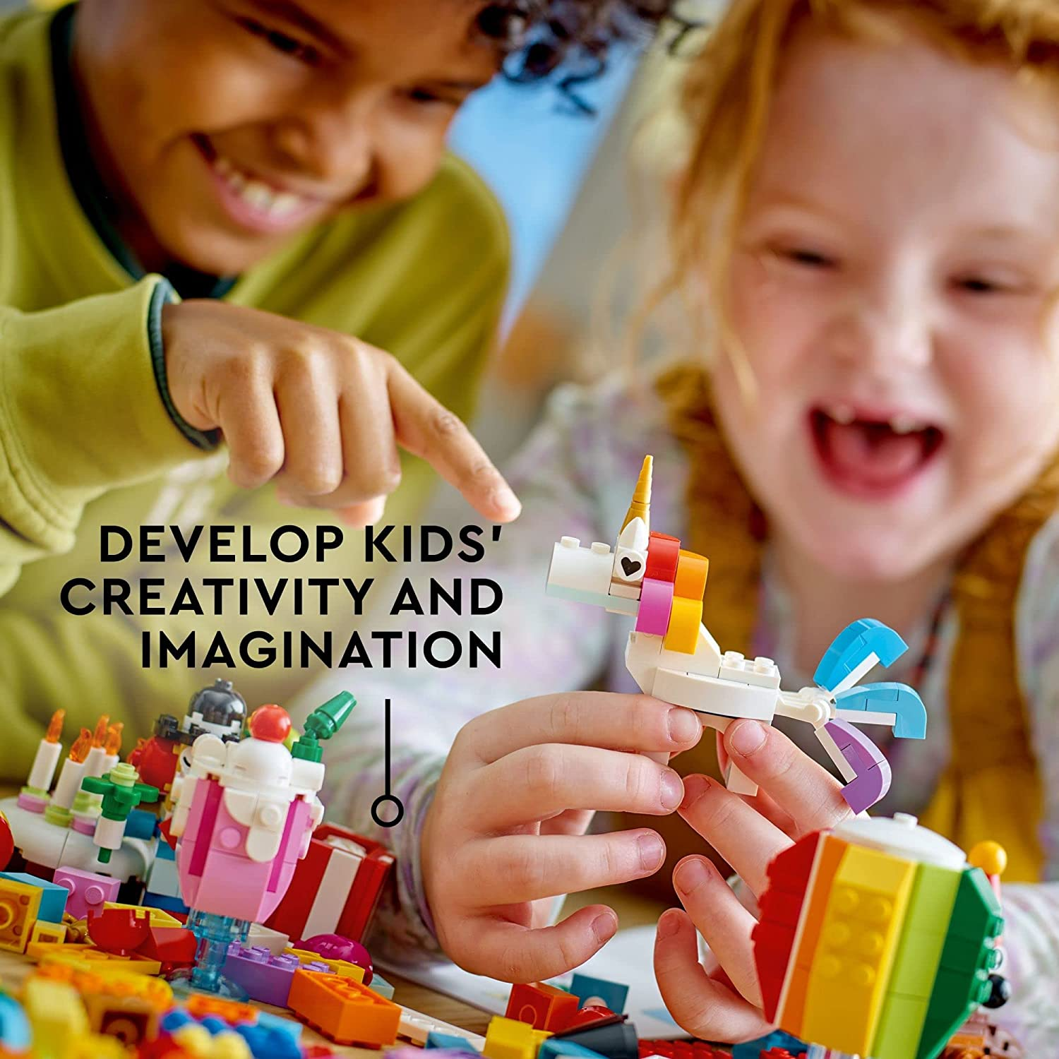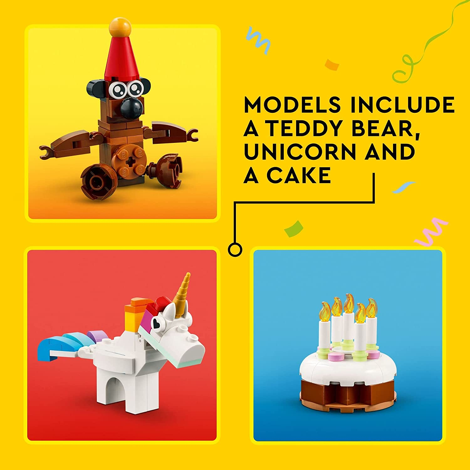 Bring friends and family together with the fun building activities found inside this LEGO Classic Creative Party Box (11029) building toy set. This colorful mix of LEGO bricks for ages 5+ delivers a great shared play experience, whatever the occasion. Play together and share the Creative Box with this colorful collection of 900 LEGO building bricks. The pieces are grouped into 6 bags, each containing the bricks and clear printed building instructions to make 2 easy-to-build models. The 12 mini builds include a teddy bear, clown, unicorn toy, piñata, rainbow, cake, popcorn, balloons and small presents. It’s a great set for kids' and adults' family games, or for any celebration – and when the event is over, the creative building needn’t stop! A digital version of the set’s building instructions can also be found within the LEGO Builder app. LEGO Classic 5+ toys put ideas and inspiration into kids’ hands and provide a perfect opportunity for adults to share building fun and developmental milestones with their children. This LEGO Classic Creative Party Box makes a fantastic gift for the whole family to share precious moments together.