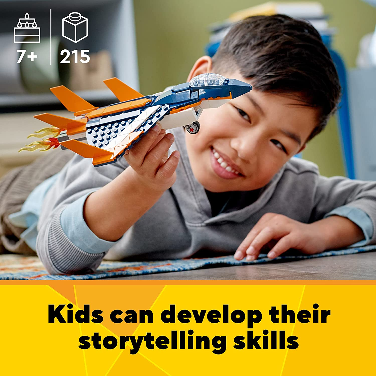 Kids aged 7 and up can enjoy thrilling playtime action high in the sky or on the water with this fantastic LEGO Creator 3in1 Supersonic-jet (31126) building toy. It features a superfast air race jet with a cockpit, retractable wheels, flames shooting from the engine and a stand for display.LEGO toys for imaginative play.LEGO fans who love fast-paced action have 3 different authentic models to build and play with in this LEGO Creator 3in1 set. They can build a jet plane toy, then rebuild itinto a helicopter or a speed boat, or use the 215 bricks to create their own cool vehicle. A digital experience for LEGO builders.The toy set comes with interactive digital building instructions to make the building experience even more fun. Available in the LEGO Building Instructions app for use on smartphones and tablets, the zoom and rotate tools help kids visualize the model as they build.