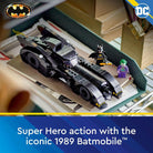 LEGO DC Batmobile: Batman vs. The Joker Chase (76224) puts Super Hero action with Batman's iconic 1989 Batmobile into the hands of kids ages 8 and up. This DC Super Hero playset brings all the drama and excitement of the classic 1989 movie to life. A lift-off roof provides access to the vehicle’s cockpit, with room for a minifigure in the driving seat. When kids turn a control on the side of the car, 2 built-in blasters rise into position. A flame accessory attached to the tailpipe revolves as the Batmobile moves, and a flip-open trunk provides storage space for the included Batarang, harpoon spike and handcuffs. There are 2 minifigures included in this DC Super Hero toy – Batman and The Joker – plus accessories including a helmet and cape, making this the ultimate DC birthday gift for 8 year old kids. For added digital fun, builders can zoom in, rotate models in 3D and track their progress using the fun, intuitive LEGO Builder app. Contains 438 pieces.