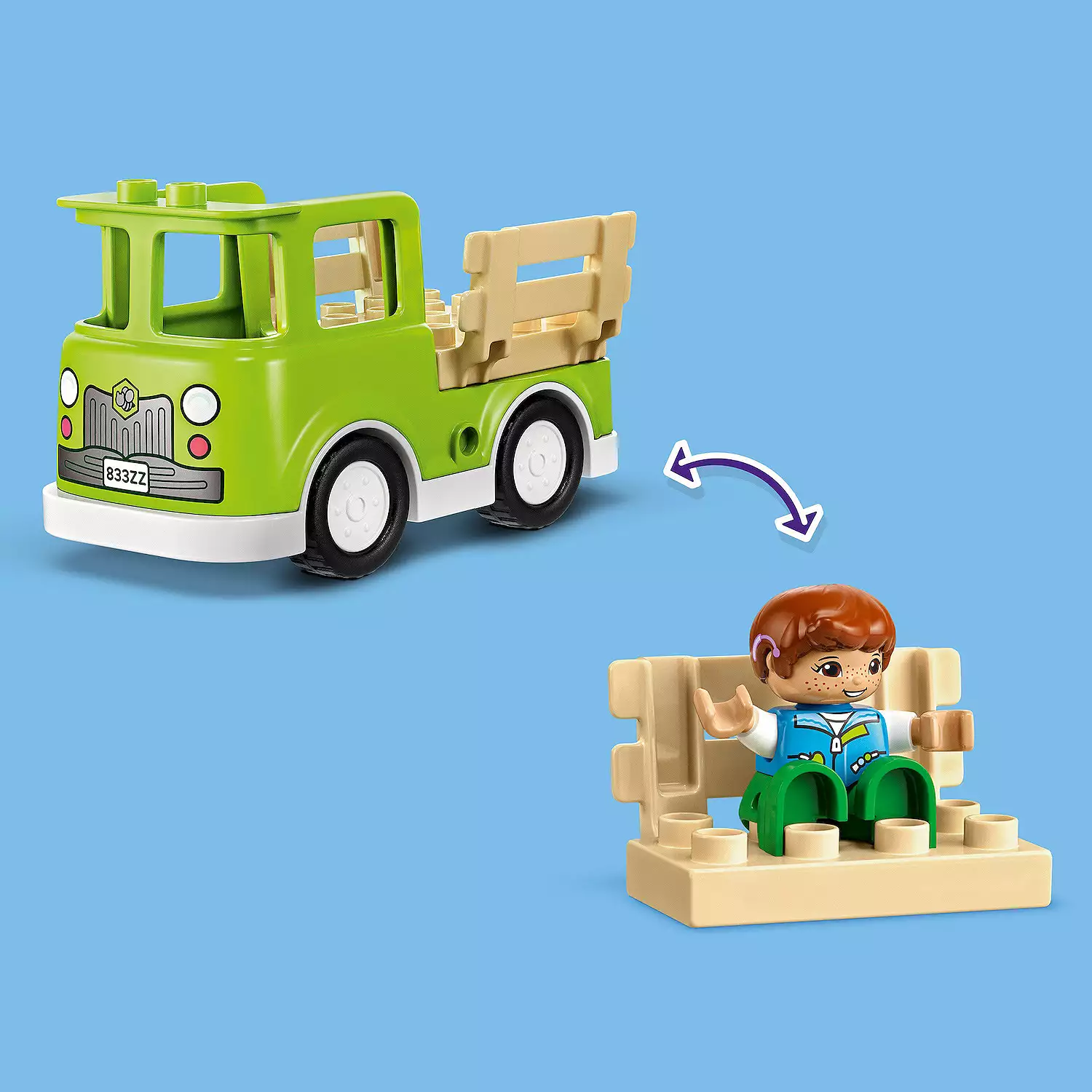Build-and-rebuild toy – Toddlers hone fine motor skills as they convert the toy truck's load bed into a table with benches, where the LEGO DUPLO figures can enjoy some honey-sweetened tea