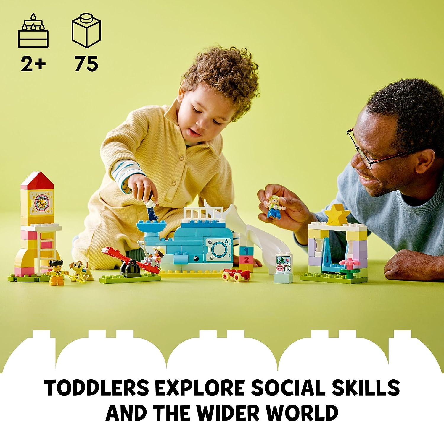 Bring the outdoors inside with this fun and versatile LEGO DUPLO Town Dream Playground (10991) building toy set. Toddler boys and girls ages 2+ build an epic playground. A creative birthday gift, this educational playground STEM toy is packed with modern equipment. Toddlers learn through play about letters and numbers while climbing the whale toy structure. There’s a diverse range of characters for kids to befriend, including a skater kid and a cute guide dog! As they play with these figures, toddlers have fun learning social skills they can use in real life. LEGO DUPLO Town construction sets help preschoolers explore the world they see around them and role-play modern life. Like all LEGO DUPLO toys, this one is packed with diverse learning opportunities. The brightly colored, easy-to-hold bricks and fun moving parts stimulate kids’ senses and help them develop fine motor skills. Contains 75 pieces.