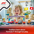 Start your engines and get ready to race with the F1 Team Race Cars & Drivers (10445) building toy. Boys and girls ages 2 and up get to experience the thrill of open wheel racing with this F1 LEGO set. This imaginative toddler car toy is packed with playful adventures, learning experiences, and interactive play. Little ones can create buildable LEGO F1 toy racing cars. Set also includes start lights and a podium. All 10 teams are represented, putting toddlers in the driver’s seat as they customize their cars and choose who wins the race and the trophy. This educational toddler toy helps kids to develop spatial awareness and practice fine motor skills using the crane toy’s lifting function to deliver a rapid pitstop. Inspire boys and girls to practice their color-sorting skills with this playset, as they identify teams with distinctive colors, and learn perseverance as they race against family members to determine who wins first place! Contains 70 pieces.