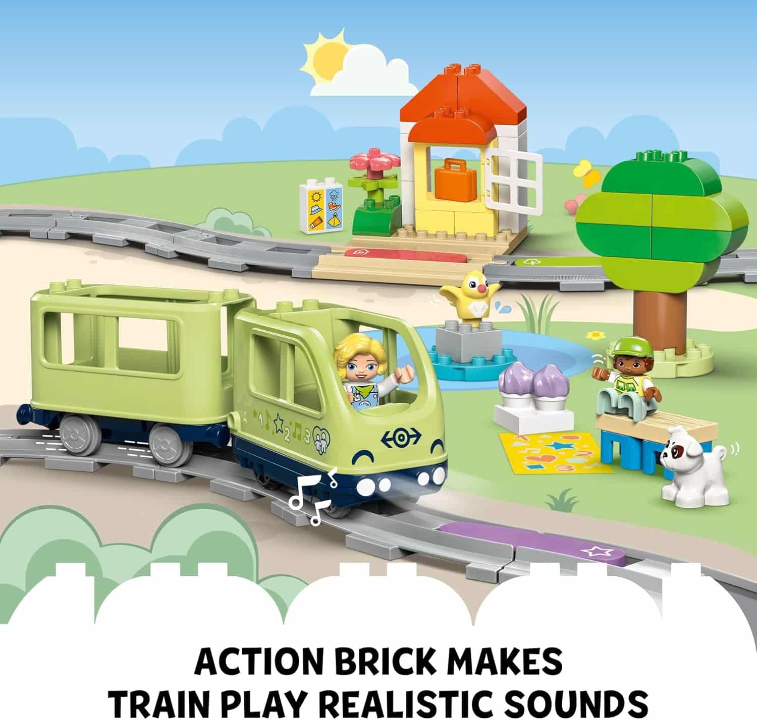 Set off on an exciting journey with the LEGO DUPLO Interactive Adventure Train (10427) toy for toddlers aged 2-4. This build-and-rebuild toy lets preschoolers use their imagination and creativity. Kids can use the detailed building blocks – which includes a park, beach, train station or family home – and the visual and sound effects of this set to create a playful, interactive experience filled with hours of fun. Toddlers will love the lights and sound features of this toy train. The 3 action bricks make realistic noises, let kids record and play their own sounds and drive the train using the LEGO DUPLO Interactive Trains app. This educational toy boosts toddlers’ focus, patience, fine motor skills and creativity as they build the train set and deciding passenger train routes. Contains 57 pieces.