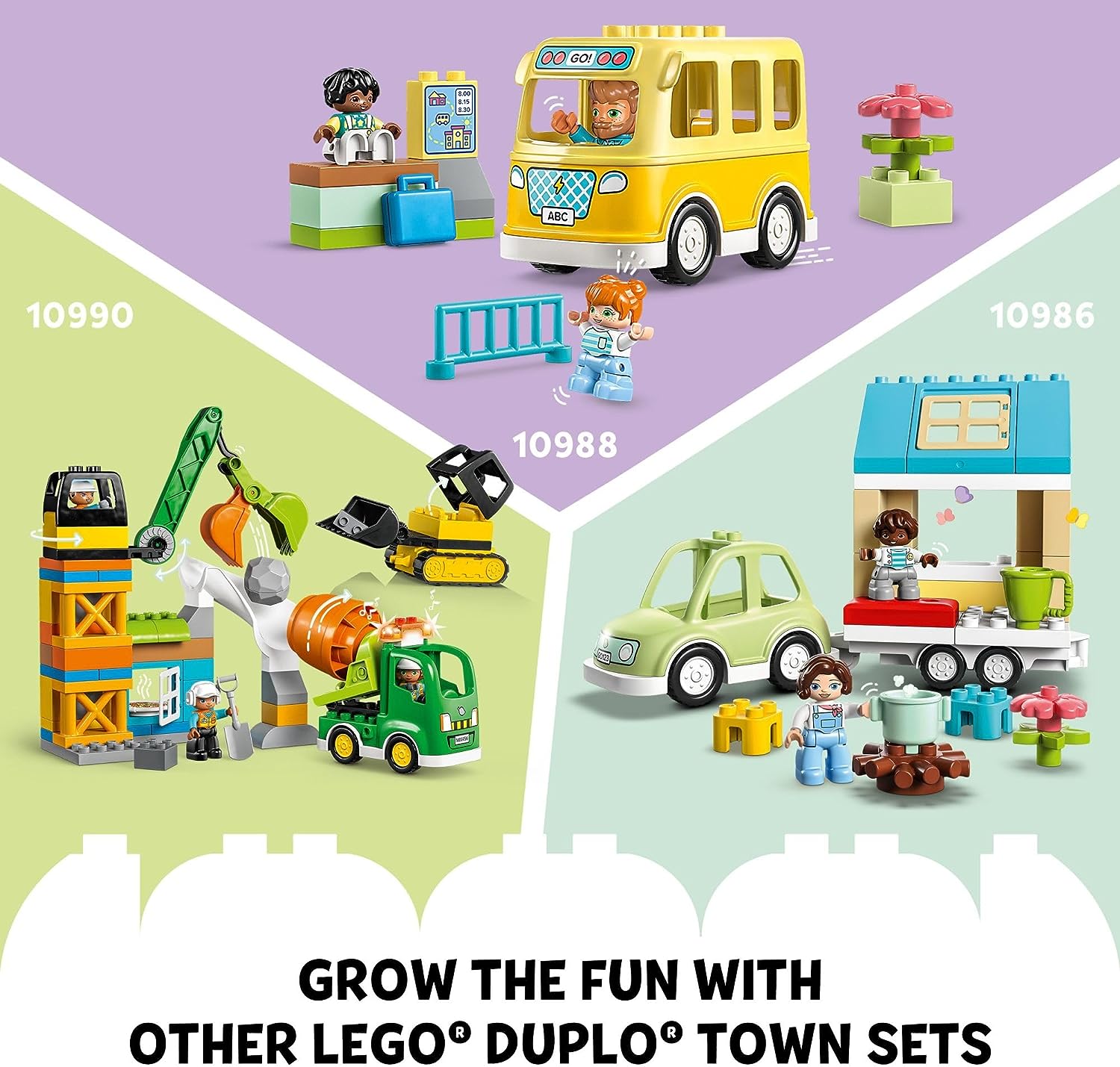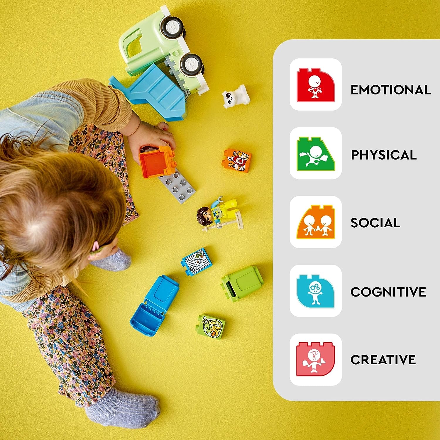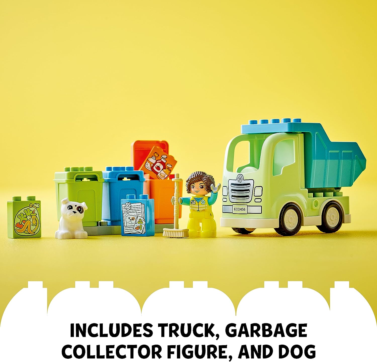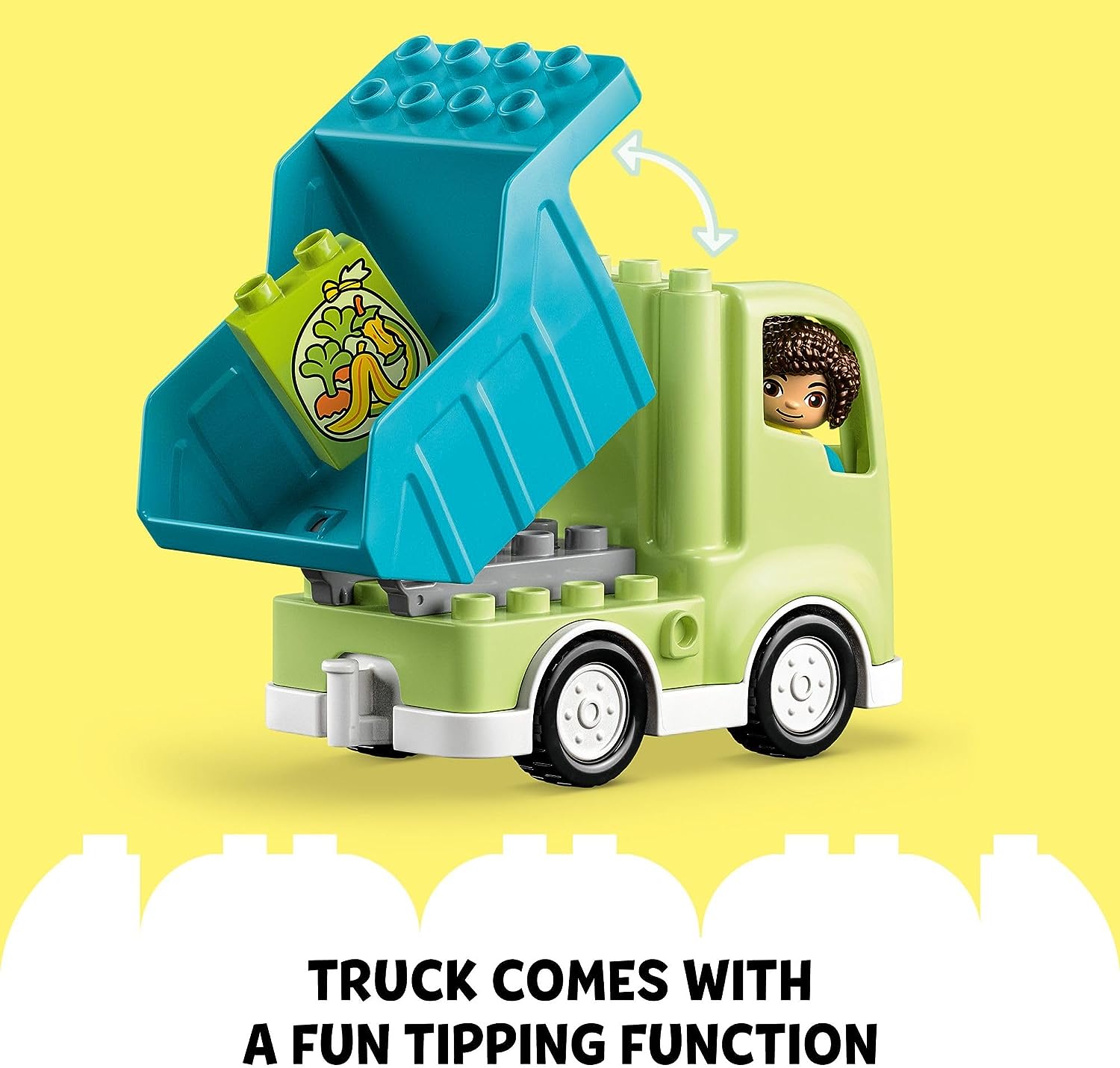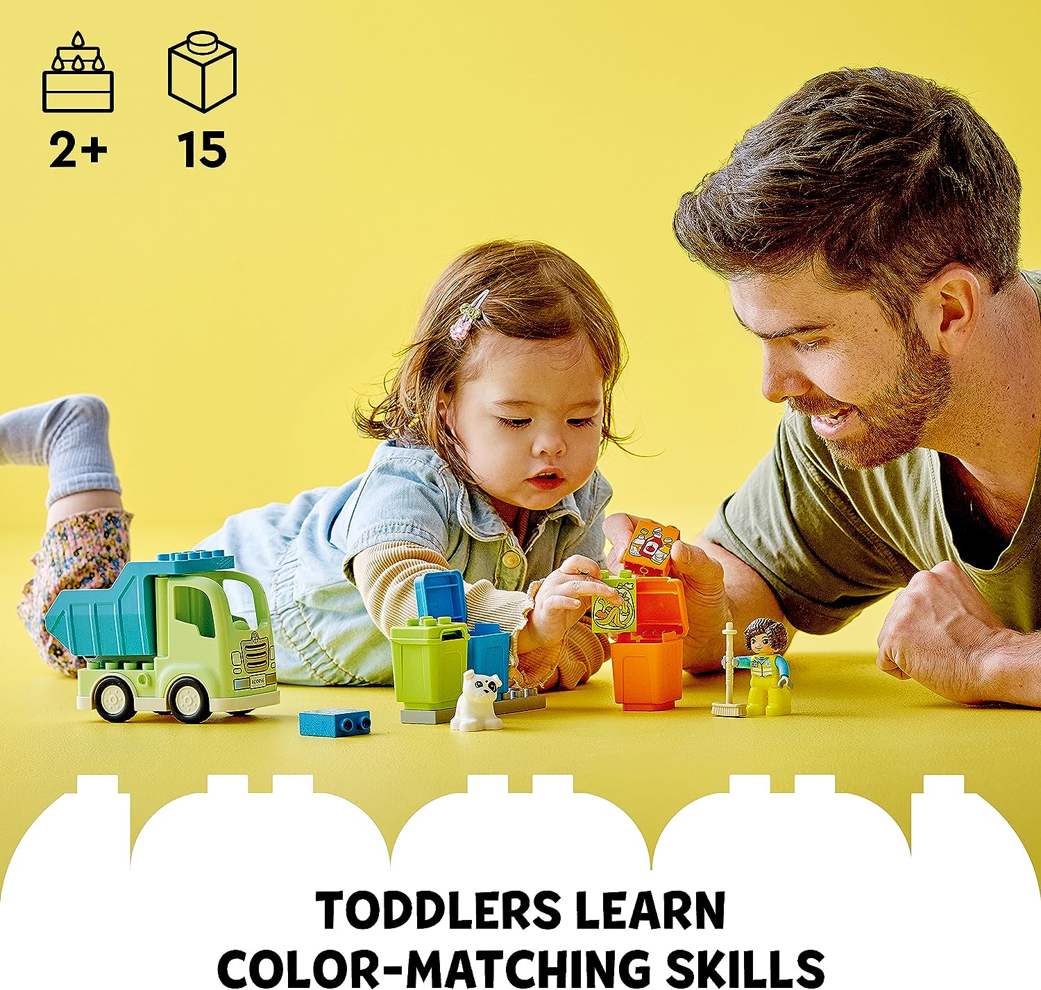 Help toddlers, boys and girls ages 2+ tidy up the town with LEGO DUPLO Town Recycling Truck (10987) toy. This realistic garbage truck toy lets curious young minds play out the world they see around them as they learn about recycling, sorting the garbage into the correct bins and dumping the trash into the truck. During the waste-sorting fun toddlers get familiar with their colors by working out which piece of trash belongs to its color-matching sorting bins. These have hinged lids that refine motors skills as little fingers open and close them to tidy away the trash. Preschoolers will love to drive the truck and tip out its load once they reach their destination – the dump. Kids learn as they role-play with this hands-on STEM toy helps kids develop fine motor skills as they role-play the real-life adventures of an everyday hero who befriends a lost puppy and takes it for a ride in the truck. Contains 15 pieces.