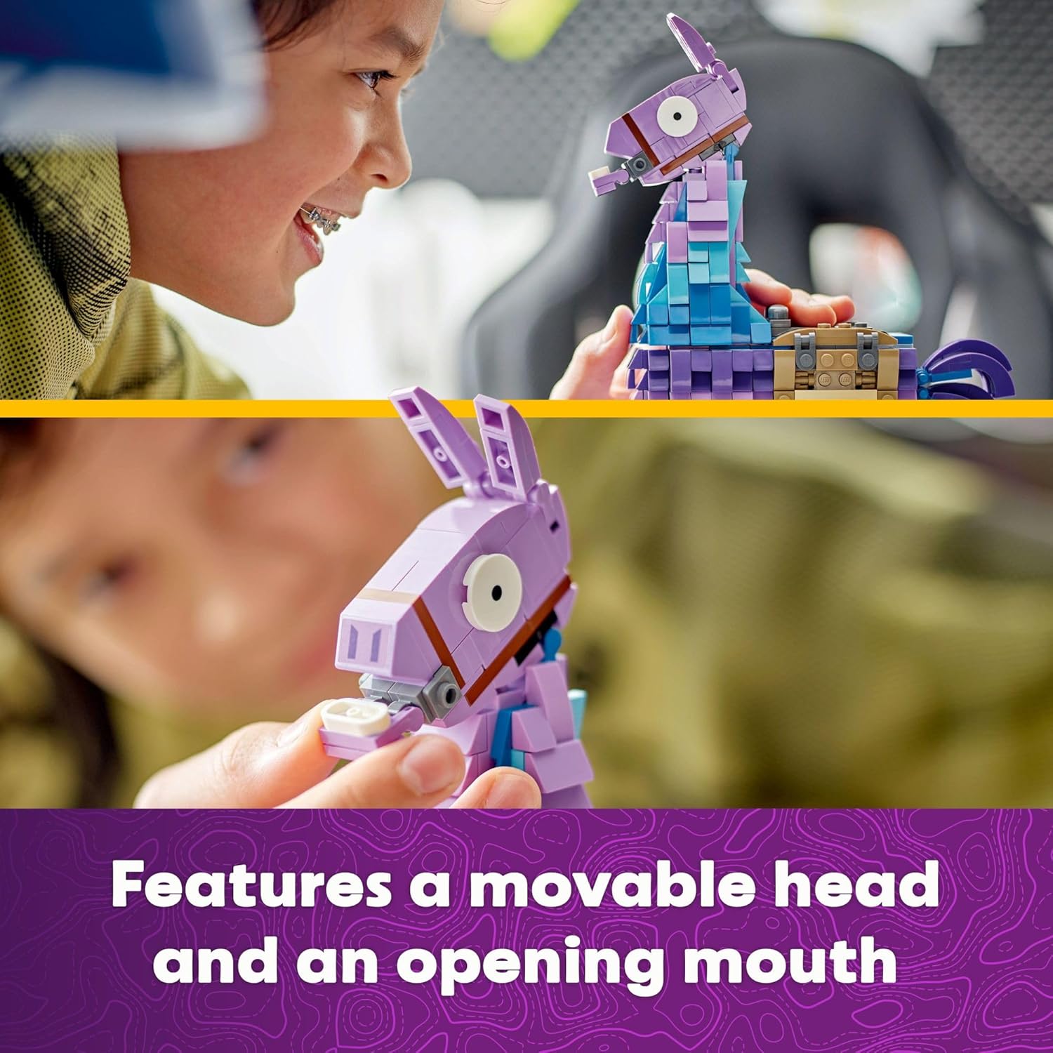 Bring gaming adventures to life with this LEGO Fortnite Supply Llama (77071) building set for gamers. Inspired by the LEGO Fortnite video game, it lets fans ages 12 and up create a unique toy for display. Young gamers will have hours of fun assembling the Fortnite llama piñata, also known as the Supply Llama in the LEGO Fortnite video game. Packed with fun details to inspire creative play, this building toy features a movable head and an opening mouth as well as a saddle and loads of cool gear. Accessories include a Grappler, Slurp Juice, Rough Ruby, Back Pack, Good Luck Charm, Slap Juice and Dynamite. Based on exciting items from LEGO Fortnite, these objects encourage kids to recreate their favorite gaming moments off screen. Once fans have finished building the Fortnite toy and discovered its details, it becomes an awesome play-and-display model to showcase proudly in their bedrooms or gaming rooms. It also makes a thoughtful gift for gamers and Fortnite fans. Contains 691 pieces.