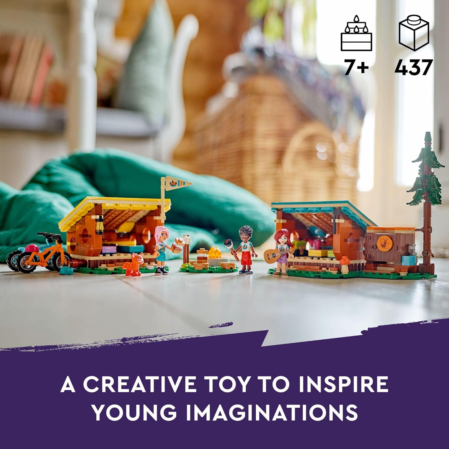 The LEGO Friends Adventure Camp Cozy Cabins (42624) playset for kids ages 7 and up comes with 3 mini dolls, a fox and lots of camping toy accessories so girls and boys can enjoy fun adventures. This LEGO toy building set for kids makes imaginative pretend play so much fun. Young builders tell the story of Paisley, Zac and Sky as the friends enjoy a cozy camping trip. The set includes 2 buildable shelters with roofs that lift for easy access. The friends put the sleeping bags inside, ready for nightfall. Then Zac and Sky ride the 2 mountain bikes while Paisley writes songs on the lute. In the evening, the friends relax by the campfire, where they toast marshmallows and make the traditional campfire treat – s’mores. Discover more gift ideas for kids with LEGO Friends sets (sold separately), where there are lots of opportunities for kids to act out real-life adventures. This set comes with the LEGO Builder app, here kids can zoom in and rotate models in 3D, save sets and track progress. Contains 437 pieces.
