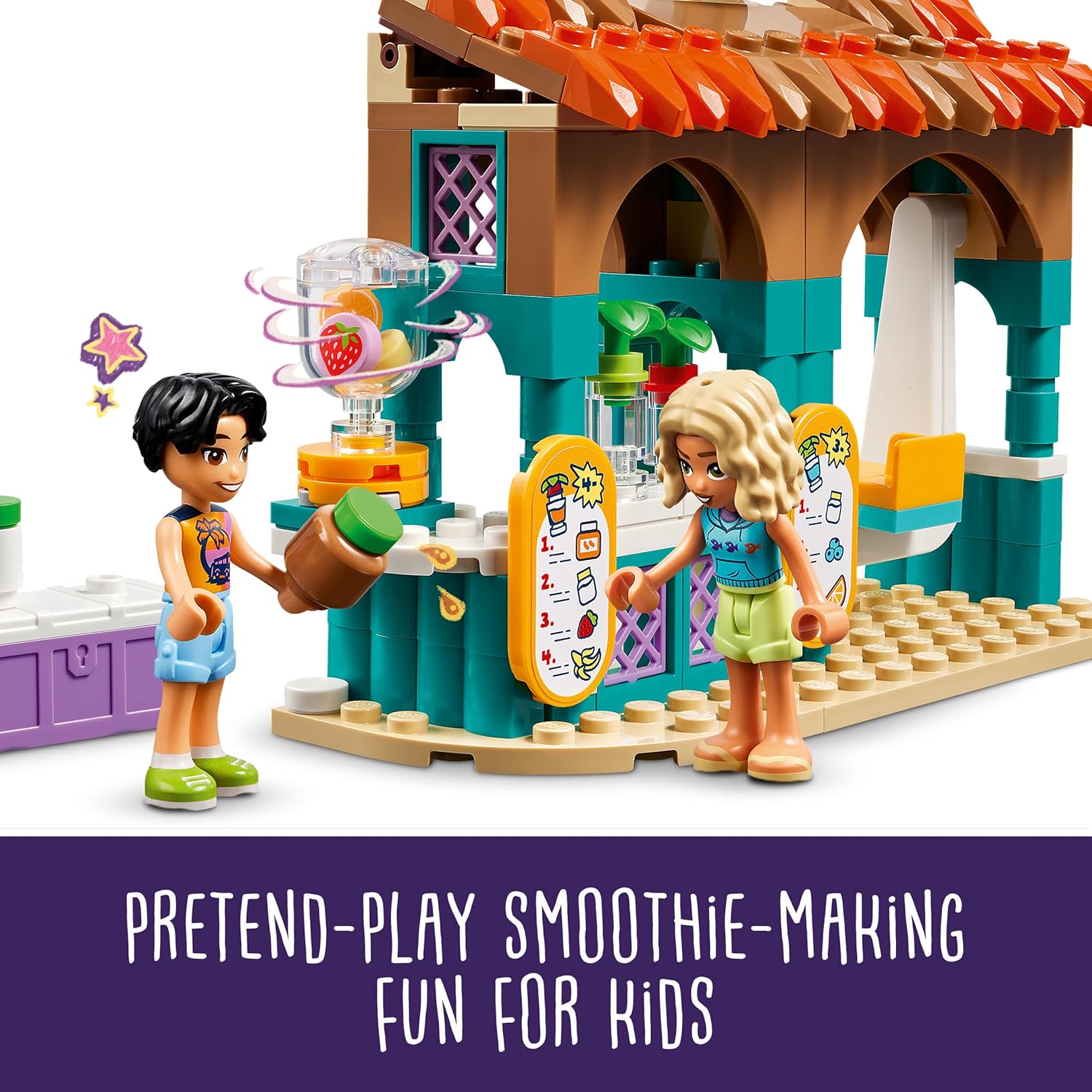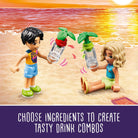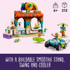 Inspire kids to get creative with this LEGO Friends Beach Smoothie Stand (42625) play food set toy for girls and boys ages 6 and up. The set comes with a buildable smoothie stand and a buildable beach toy buggy, plus LEGO Friends Nova and Niko mini dolls. Kids can create lots of different smoothie flavors by combining ingredients and then mixing them in the blender. They can act out the story as Nova and Niko relax with a drink on the swing before exploring in the beach buggy. This LEGO building set comes with lots of accessories to fuel imaginative play, including a menu board, surfboard, life jacket, dashboard camera and signpost. Discover more pretend play toys (sold separately) in the LEGO Friends universe, where there are lots more friendship stories to uncover. This set comes with the LEGO Builder app for intuitive building. Here kids can zoom in and rotate models in 3D, save sets and track progress. Contains 213 pieces.