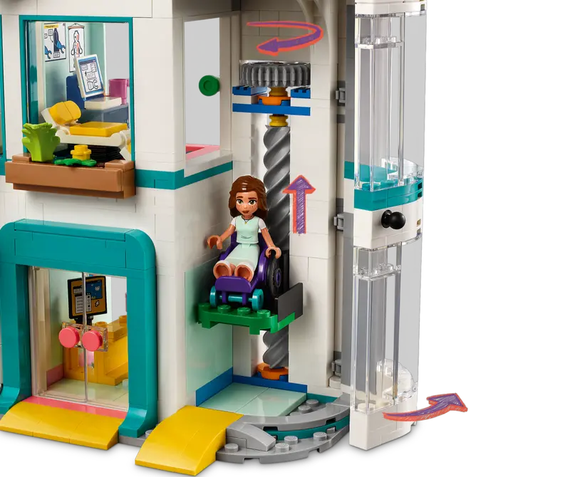 Maternity ward and working elevator – Build the different areas of this toy hospital set, including the examination room, maternity room, X-ray room, elevator and employee break room