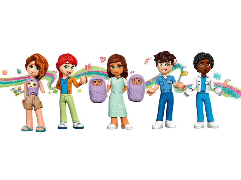 LEGO® Friends characters – Comes with 5 mini-dolls, including Autumn with an additional face to show her emotions as she has hernew prosthetic arm fitted, 2 baby figures, a toy robot and a dog figure