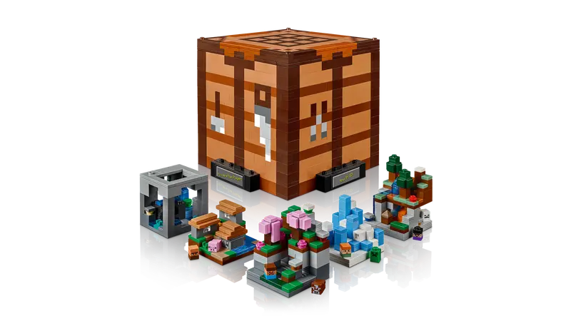 The set recreates the game’s iconic crafting table. Inside are 5 mini build modules featuring 12 Minecraft biomes, including the Taiga with a dripstone cave, Plains with a village, Ice Spikes with an igloo, Cherry Grove with an abandoned mineshaft, and the Deep Dark with a lush cave. 8 microfigures are also included: Steve, Alex, a skeleton, witch, Creeper™, villager, cow and pig. The mini builds and microfigures detach from the main model to enable a variety of display possibilities. Stickers featuring memorable in-game phrases can be added to the front of the Minecraft model. For convenience, a digital version of the set’s building instructions can also be found on the LEGO Builder app.