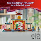 The LEGO NINJAGO Ninja Spinjitzu Temple (71831) toy for girls and boys ages 4 and up is based on season 3 of the NINJAGO Dragons Rising TV show. This dragon toy inspires little ones to play out character roles and scenes from the series. This set includes a NINJAGO tournament stage, garden, teahouse and weapons training area to inspire imaginative play. This LEGO NINJAGO set comes with 4 minifigures: Zane, Nya, Kai and Lloyd, plus a Baby Riyu dragon toy so kids can act out different roles. The minifigures can be placed on 2 turning plates for epic battles, and for added play value, there is a large range of accessories including 2 swords, 3 staffs, a hammer, a bird, a frog, a trophy, a cookie and a letter. The LEGO NINJAGO toy figures & playset also comes with a starter brick – a partly constructed base that helps kids get building quickly for an interactive experience. Contains 158 pieces.