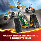Boys and girls ages 9 and up can enjoy action packed adventures from season 2 of the NINJAGO Dragons Rising TV show with this Ninja Team Combo Vehicle 4 in 1 adventure toy (71820). Kids can play with the large NINJAGO vehicle action toy before they separate it into 4 smaller vehicles: Sora’s glider with 2 stud shooters, Lloyd’s off-road racer and Cole and Nya’s motorcycle toys. This ninja playset comes with 6 NINJAGO minifigures: ninja Sora, Lloyd, Nya and Cole, dressed in their special tournament armor and armed with katana sword accessories, and their battle rivals, a Wolf Mask Warrior and Wolf Mask General. The LEGO NINJAGO range of sets and buildable ninja toys for kids includes dragons, vehicles and temples so fans can role play adventures with their heroes. Each ninja playset can be created with the LEGO Builder app, which guides you and your child on an easy and intuitive building adventure. Zoom in and rotate models in 3D, save sets and track your progress. Contains 576 pieces.