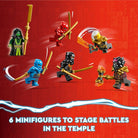 6 minifigures – Kai, Nya and Cole, who come with 2 golden katanas each, Spirit of The Temple with a large golden sword, Lord Ras with a golden hammer and Empress Beatrix with her Imperium sword